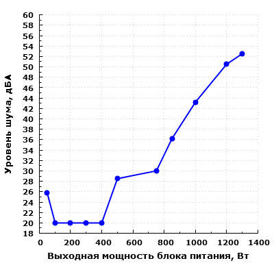 При работе на мощности до 50 Вт вентилятор блока питания не шумит (потому что не вращается), но слышен отчетливый свист электроники, в итоге шумомер регистрирует уровень шума около 26 дБА с расстояния 0,35 м (пониженный для жилого помещения в дневное время суток). При более высокой нагрузке (от 100 Вт — точно) свист отсутствует.