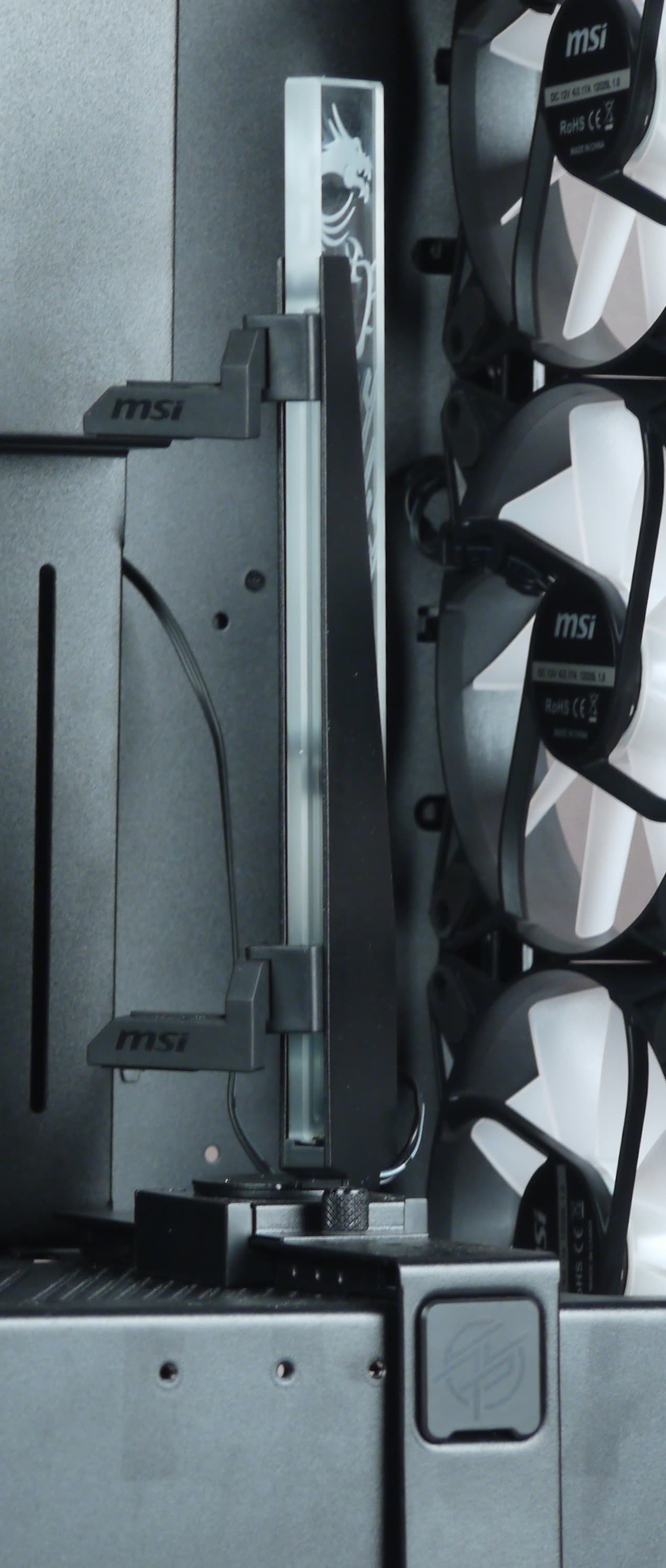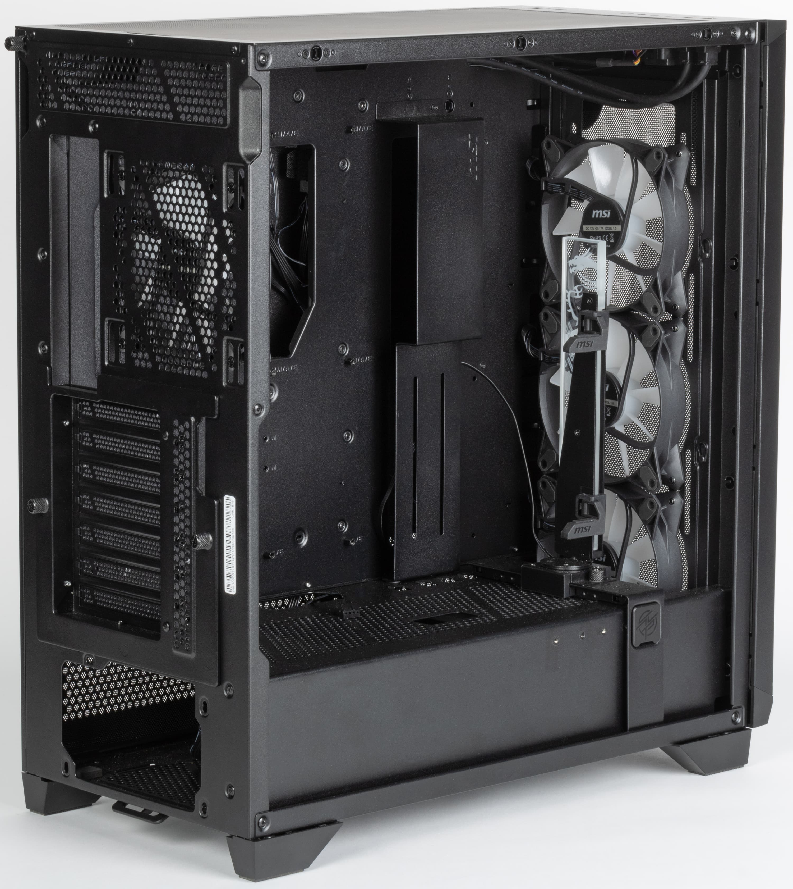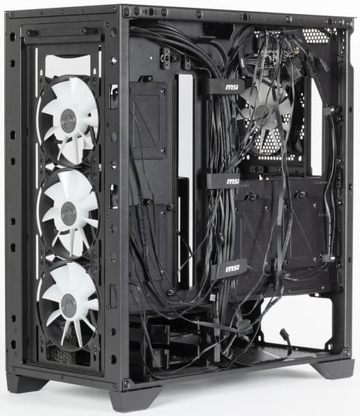 Штатно предустановлены четыре 120-миллиметровых вентилятора собственного производства с обозначением MSI 12025L 1.0: один вытяжной сзади, еще три нагнетающих спереди. Каждый из них оснащен двумя разъемами: четырехконтактным для ШИМ-управления скоростью вращения и трехконтактным ARGB для подсветки, потребление до 0,17 А, в местах крепления у вентиляторов имеются резиновые амортизирующие прокладки.