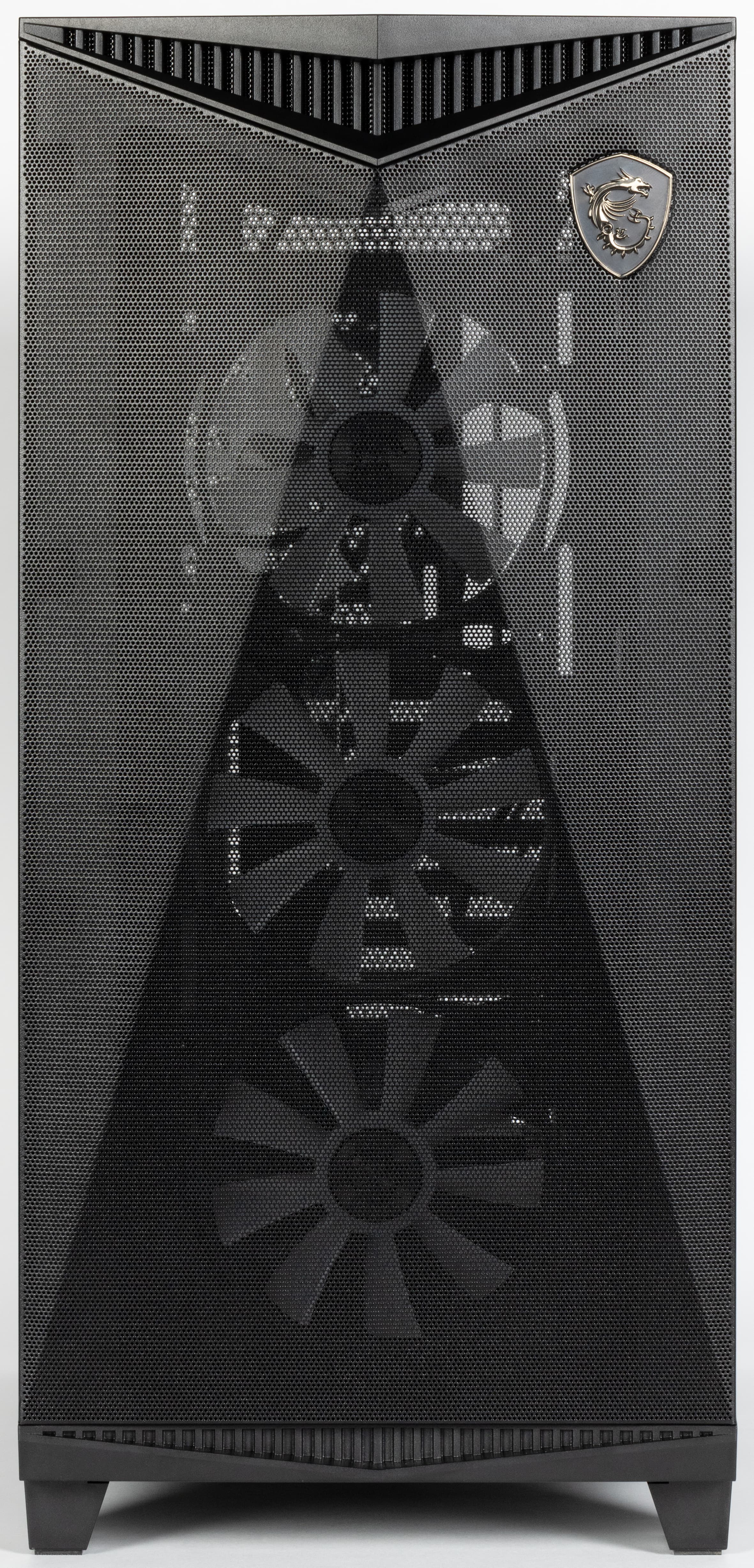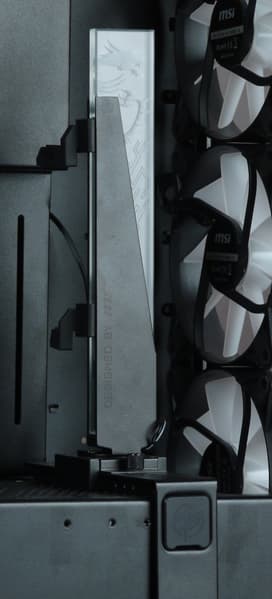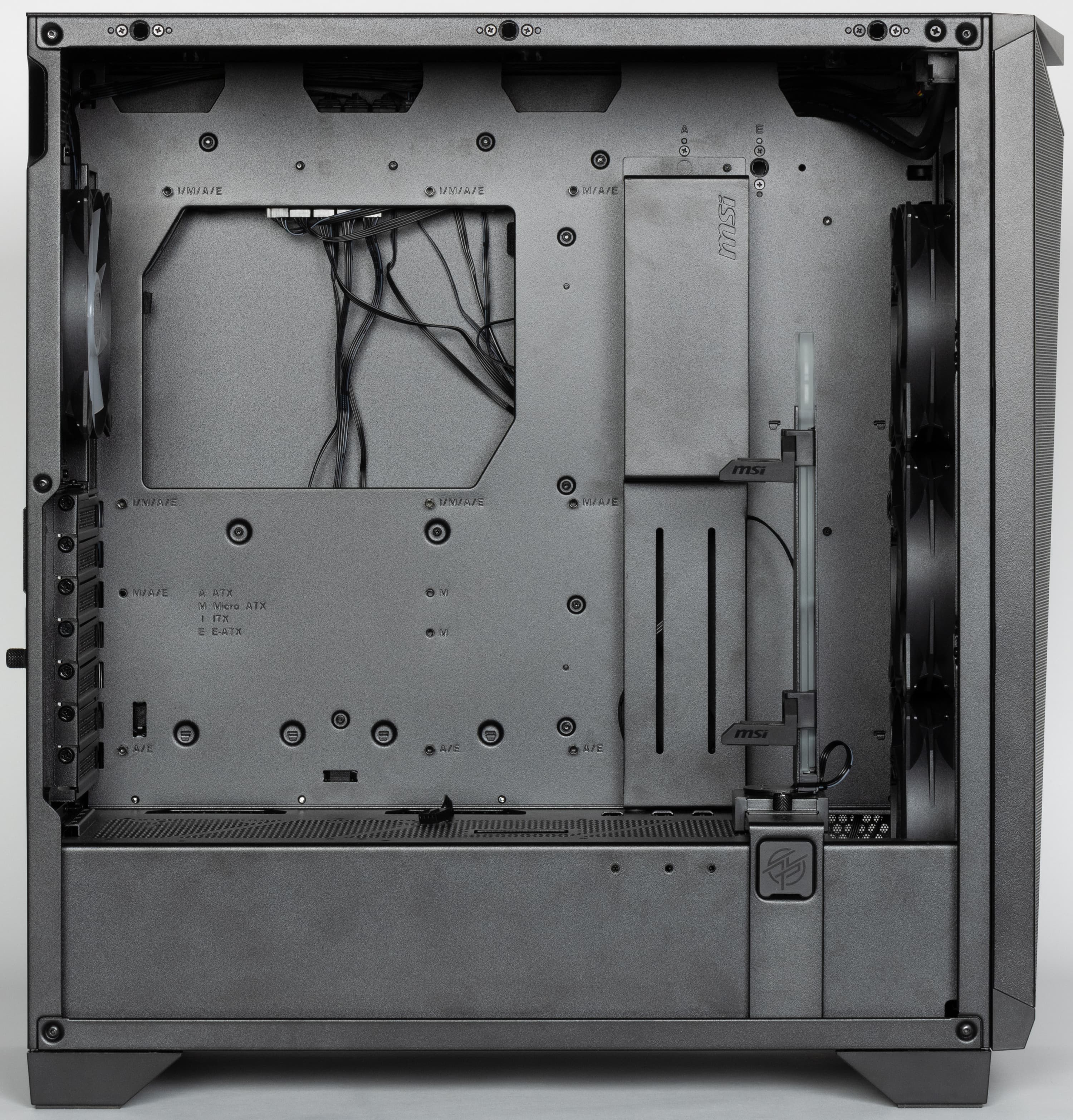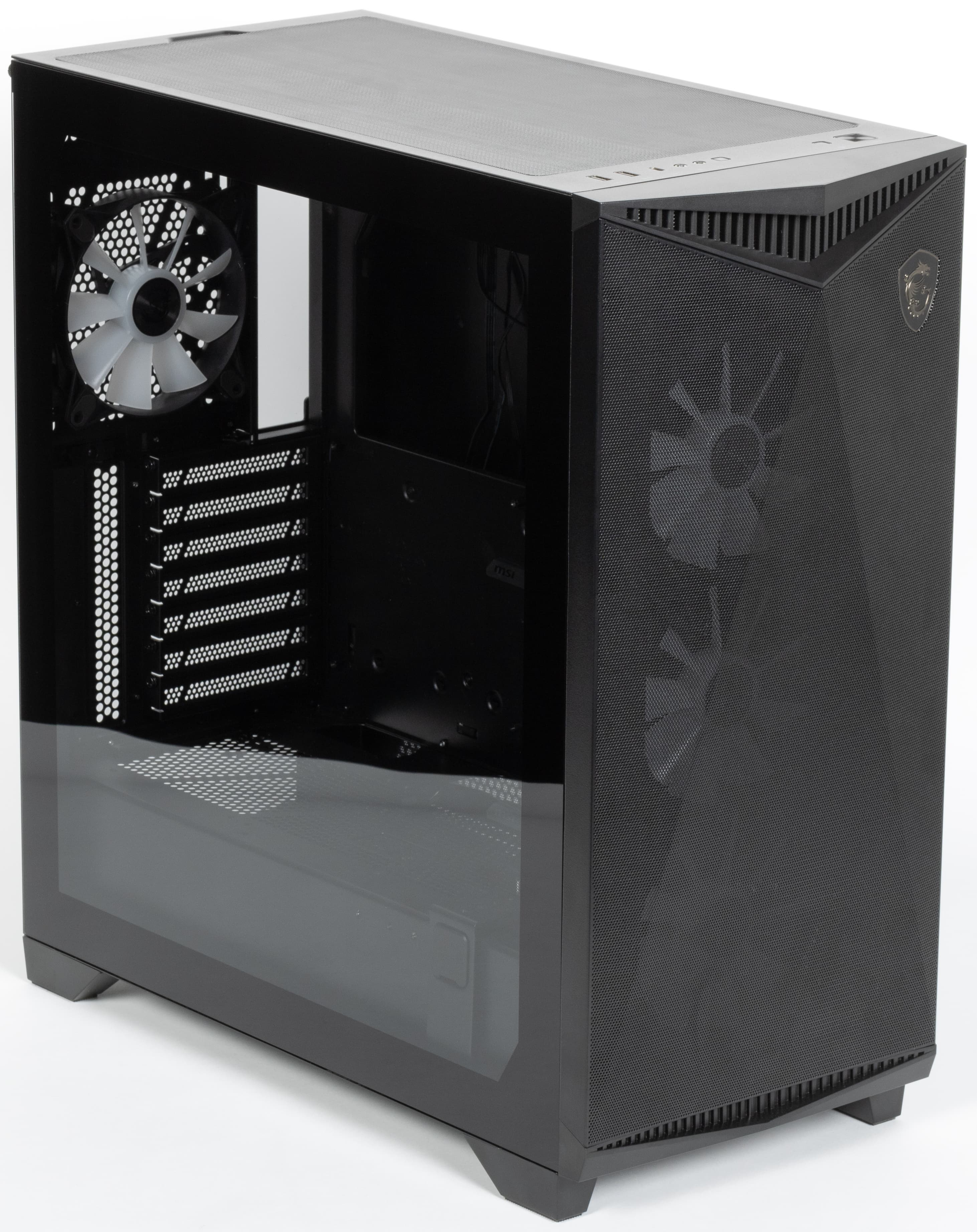 Штатно предустановлены четыре 120-миллиметровых вентилятора собственного производства с обозначением MSI 12025L 1.0: один вытяжной сзади, еще три нагнетающих спереди. Каждый из них оснащен двумя разъемами: четырехконтактным для ШИМ-управления скоростью вращения и трехконтактным ARGB для подсветки, потребление до 0,17 А, в местах крепления у вентиляторов имеются резиновые амортизирующие прокладки.