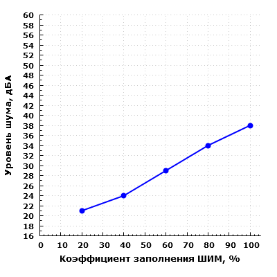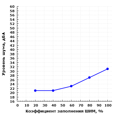 Подобные результаты можно оценить положительно, так как при минимальном КЗ уровень шума достигается очень низкий, а при КЗ=100% шум хоть и значительно повышается, но остается в пределах 40 дБА.