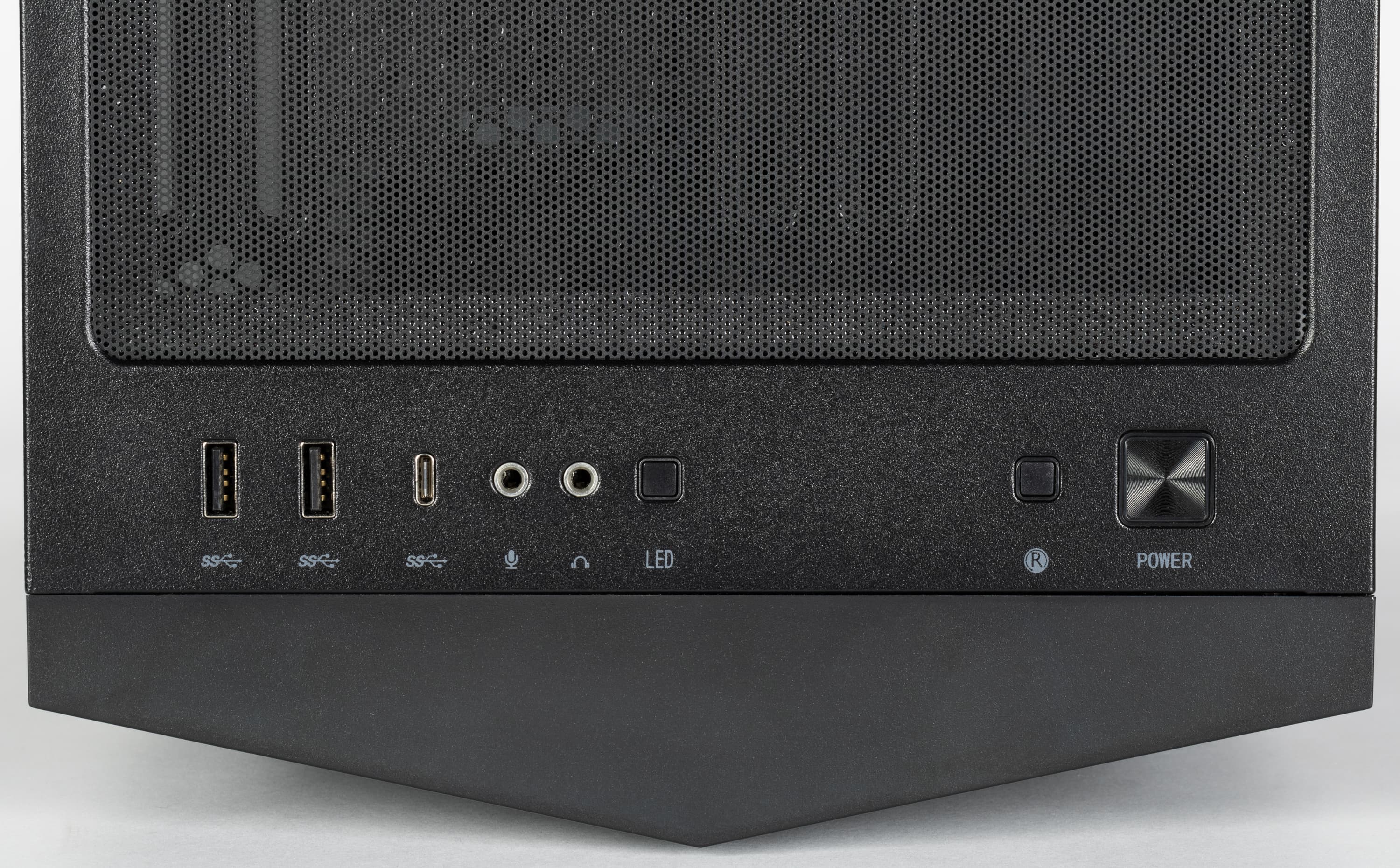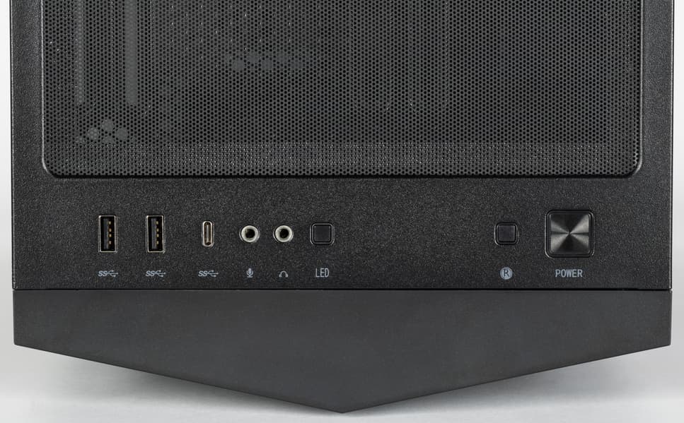 Интерфейсные разъемы и кнопки расположены на верхней плоскости возле лицевой панели. Имеются два порта USB Type-A и один USB Type-C (тех и других могло бы быть и побольше), отдельные разъемы для подключения микрофона и наушников, небольшие кнопки управления подсветкой и перезагрузки, а также кнопка большего размера для включения, окантовка которой подсвечивается белым. Усилие нажатия кнопок комфортное, свободный ход небольшой, для Power нельзя исключить срабатывания от случайного прикосновения, а для двух других подобное вряд ли возможно.