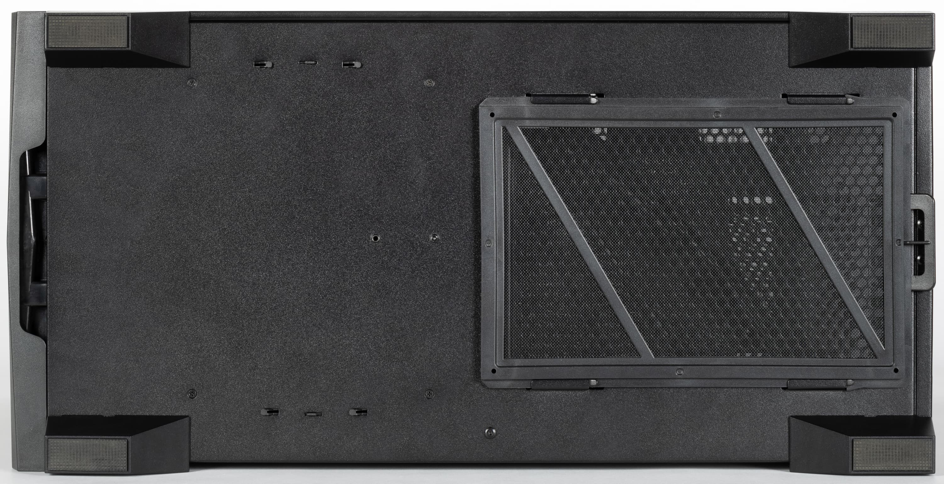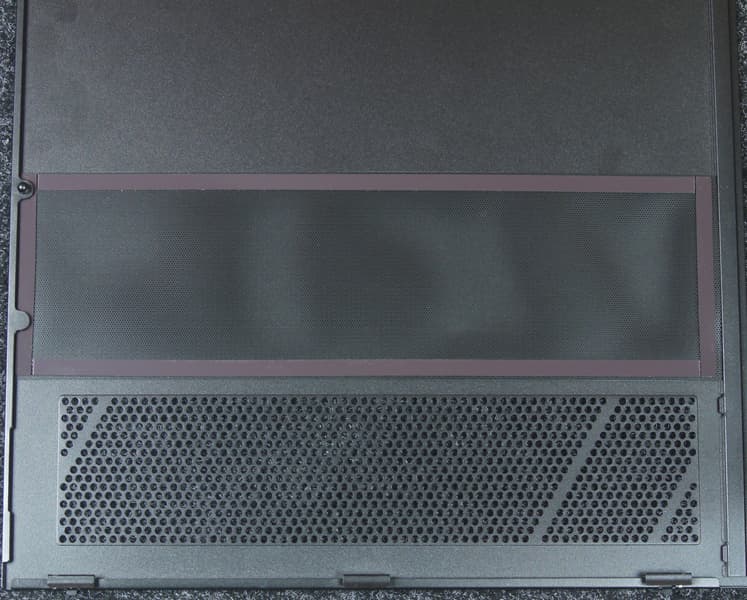 Еще один фильтр в виде мелкоячеистой капроновой сетки на пластиковой рамке расположен под днищем в месте расположения блока питания. Он выдвигается назад без вскрытия корпуса, сделать это можно на ощупь, единственная проблема с доступом к нему — позади компьютера потребуется минимум 24-25 см свободного пространства (длина фильтра с небольшим запасом).