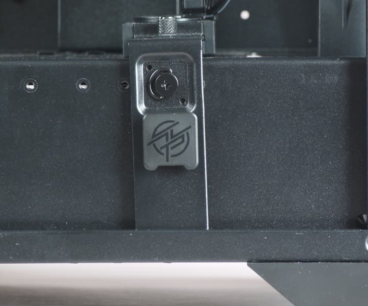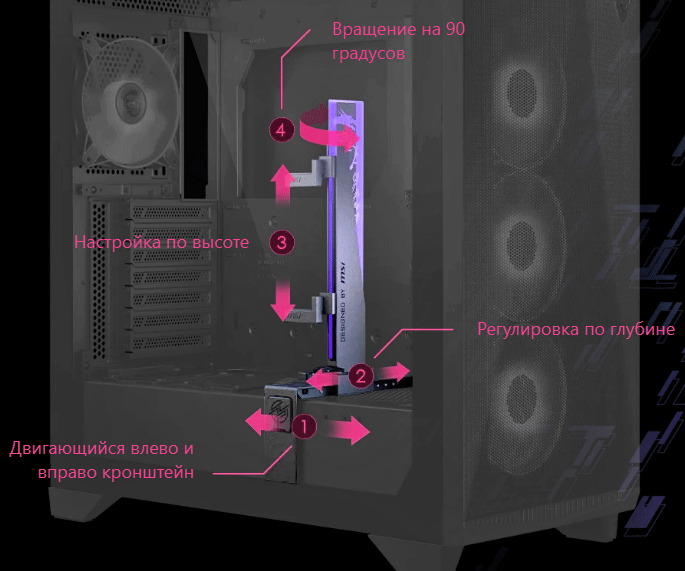 Для надежной фиксации заднего края одной или двух видеокарт имеется упоминавшаяся выше стойка, положение которой можно регулировать в соответствии с габаритами видеоадаптера: есть пять позиций по длине платы (снимаем декоративную заглушку в нижней части основания стойки, которая держится магнитами, под ней винт, откручиваем его, сдвигаем и вновь фиксируем на нужном месте в соответствии с предусмотренными отверстиями), десять позиций по ее ширине (еще один винт с накатной головкой, хорошо заметный, после его удаления с усилием сдвигаем стойку — там есть еще и подпружиненные фиксаторы).