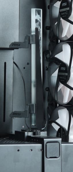 Кроме того, штатная стойка с опорами для задних краев видеокарт (о ней ниже) оснащена вертикальной прозрачной вставкой с изображением фирменного дракона, которая снизу подсвечивается набором разноцветных светодиодов. Спереди она практически не видна, но при взгляде слева через прозрачную стенку заметна очень хорошо, причем эту опору вместе со вставкой можно развернуть на 90°, чтобы дракон был виден во всей красе.