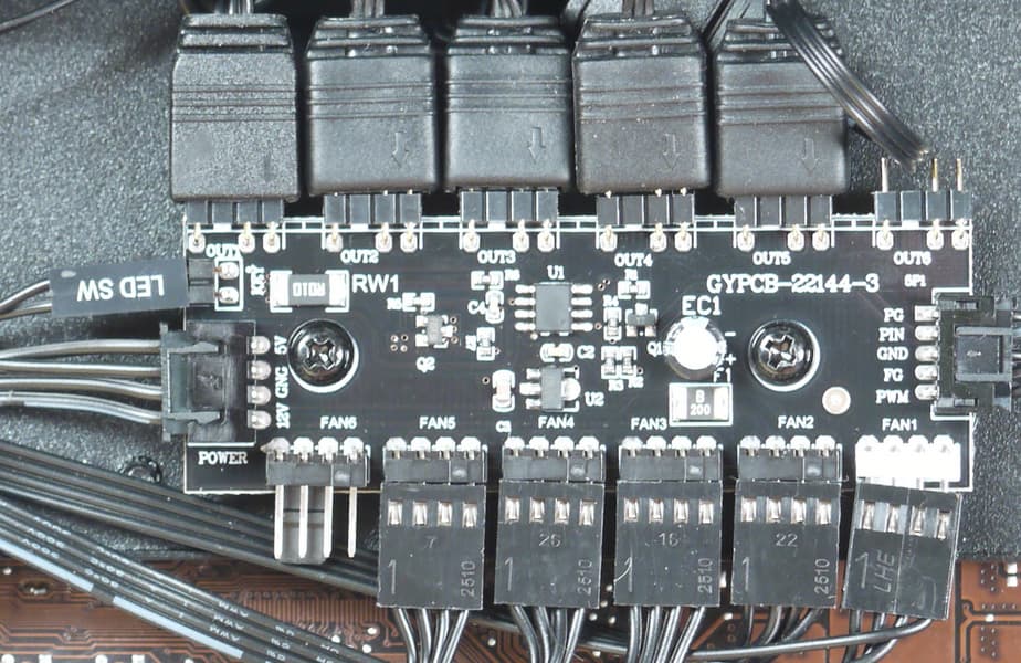 Встроенный контроллер подключается к одному из портов на системной плате и транслирует управляющий сигнал ШИМ на все подключенные вентиляторы. При желании вентиляторами можно управлять независимо, подключив их к системной плате напрямую.