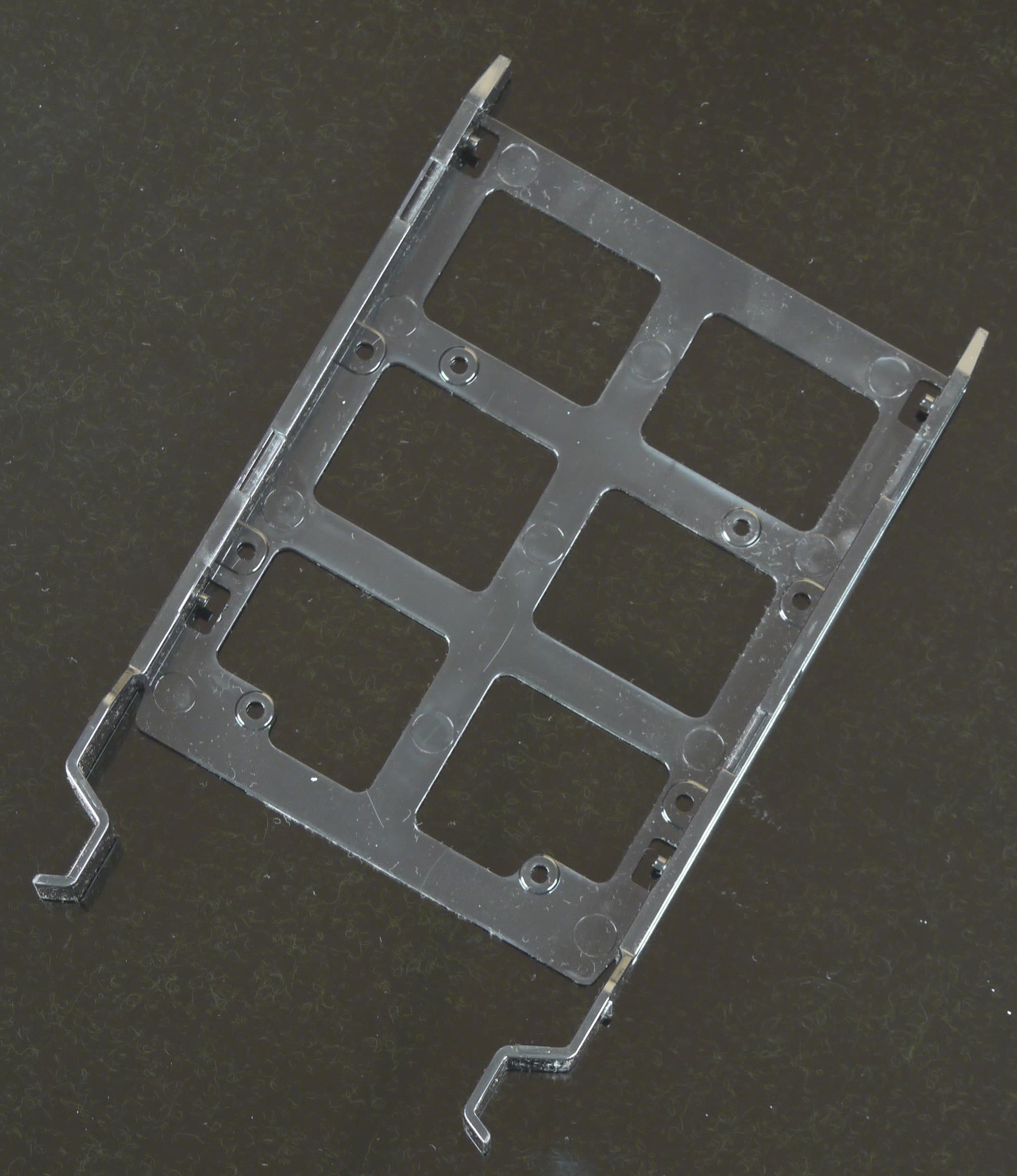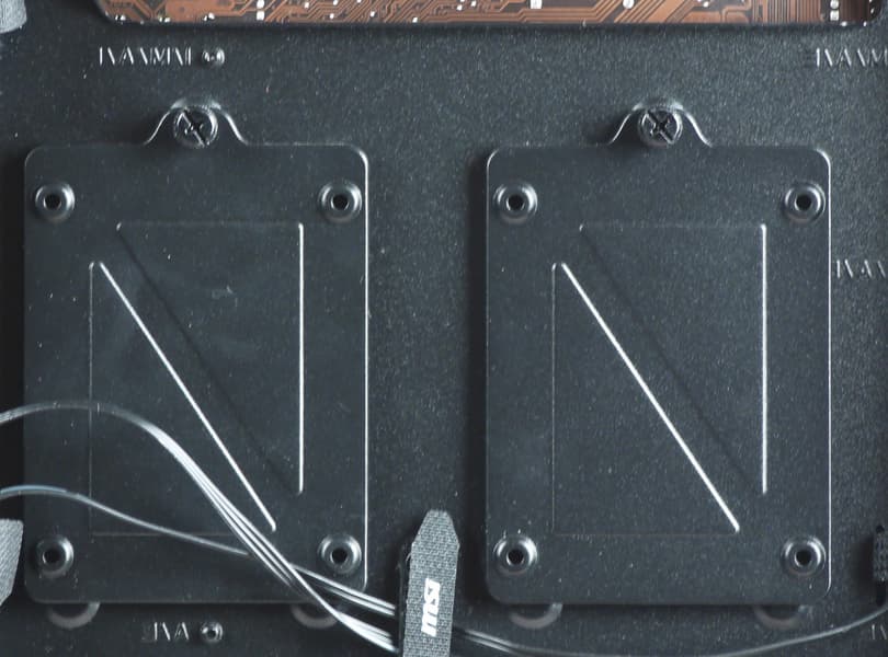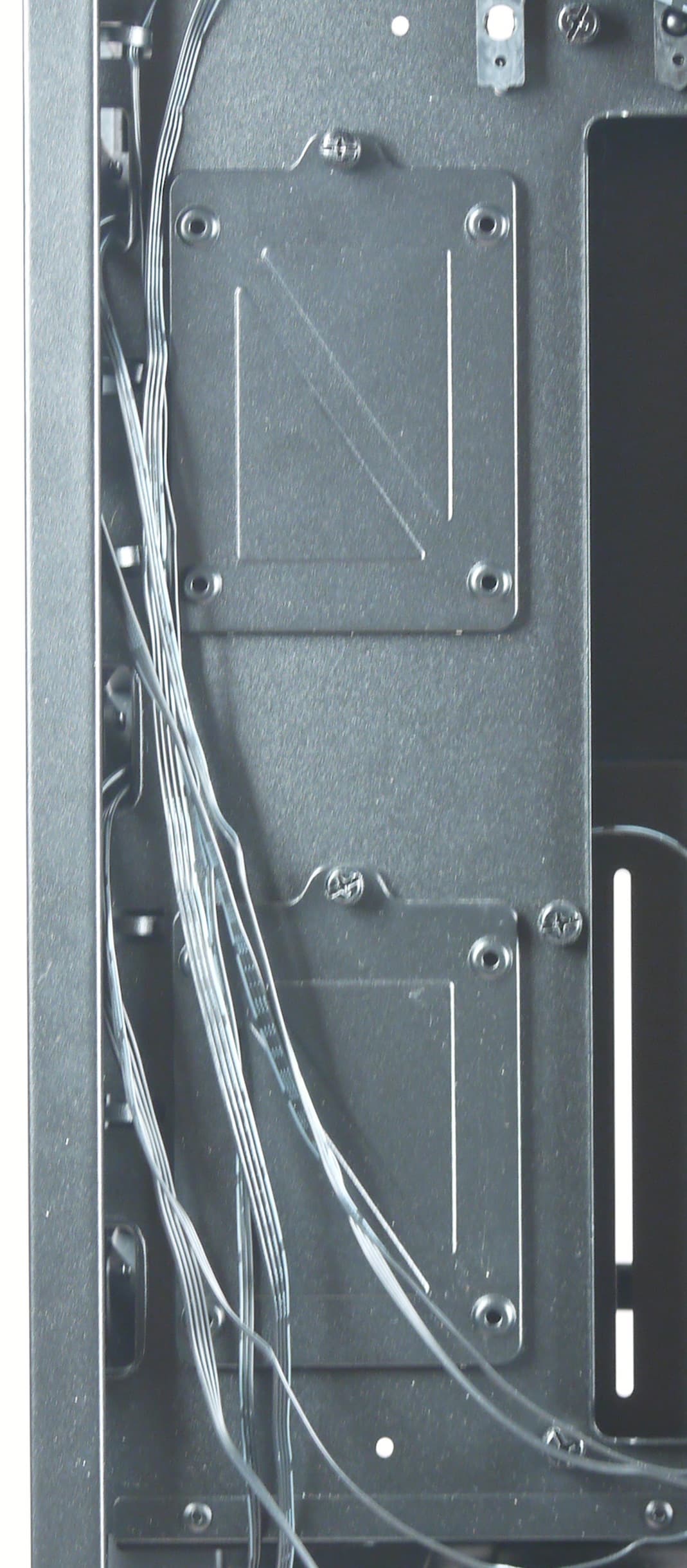 Еще четыре посадочных места для 2,5-дюймовых накопителей предусмотрены на обратной стороне основания для системной платы, где они устанавливаются с помощью монтажных пластин, играющих также роль теплоотвода. Каждая пластина крепится двумя зацепами и одним винтом с накатной головкой, а диск на ней фиксируется винтами со стороны дна.