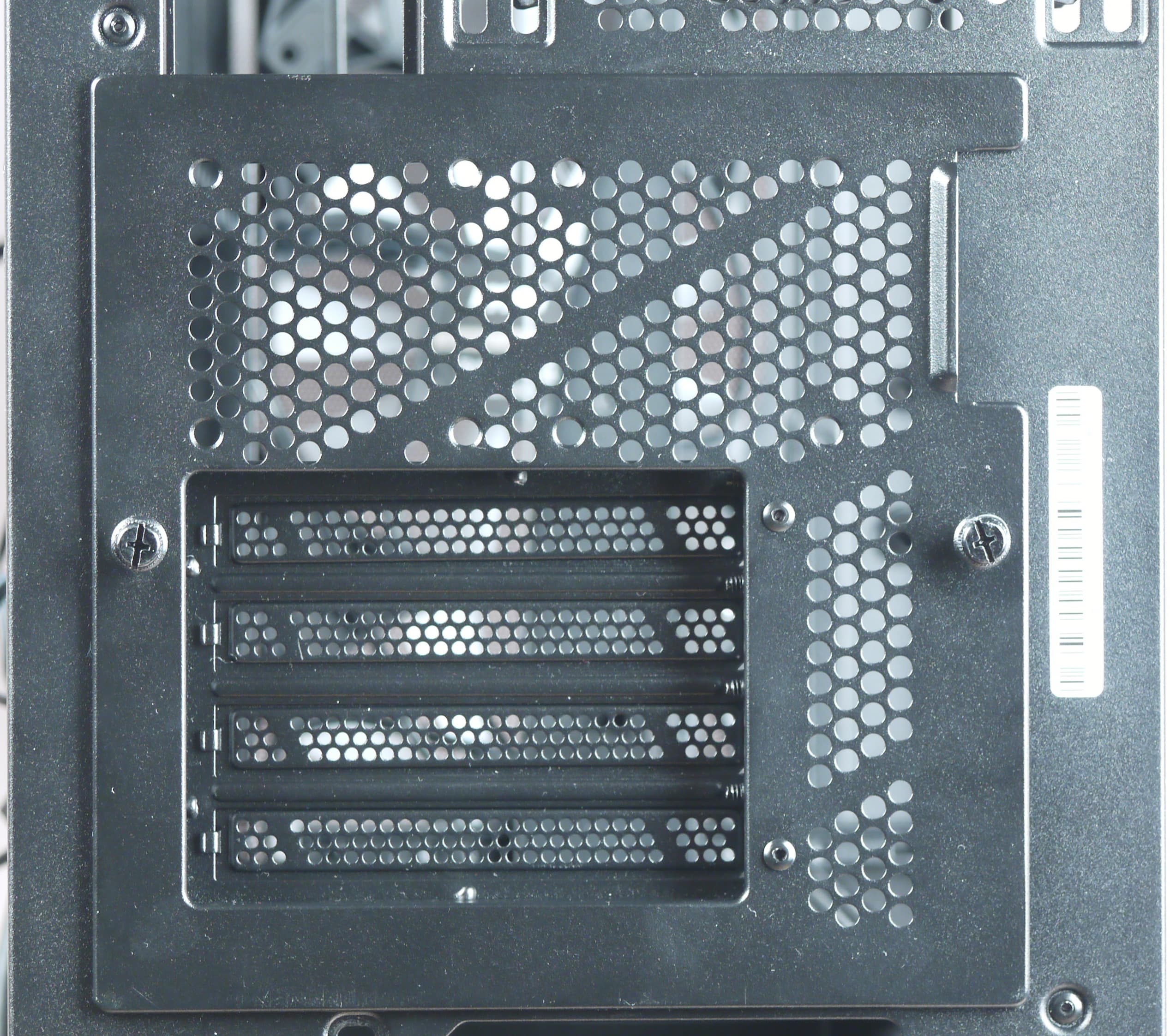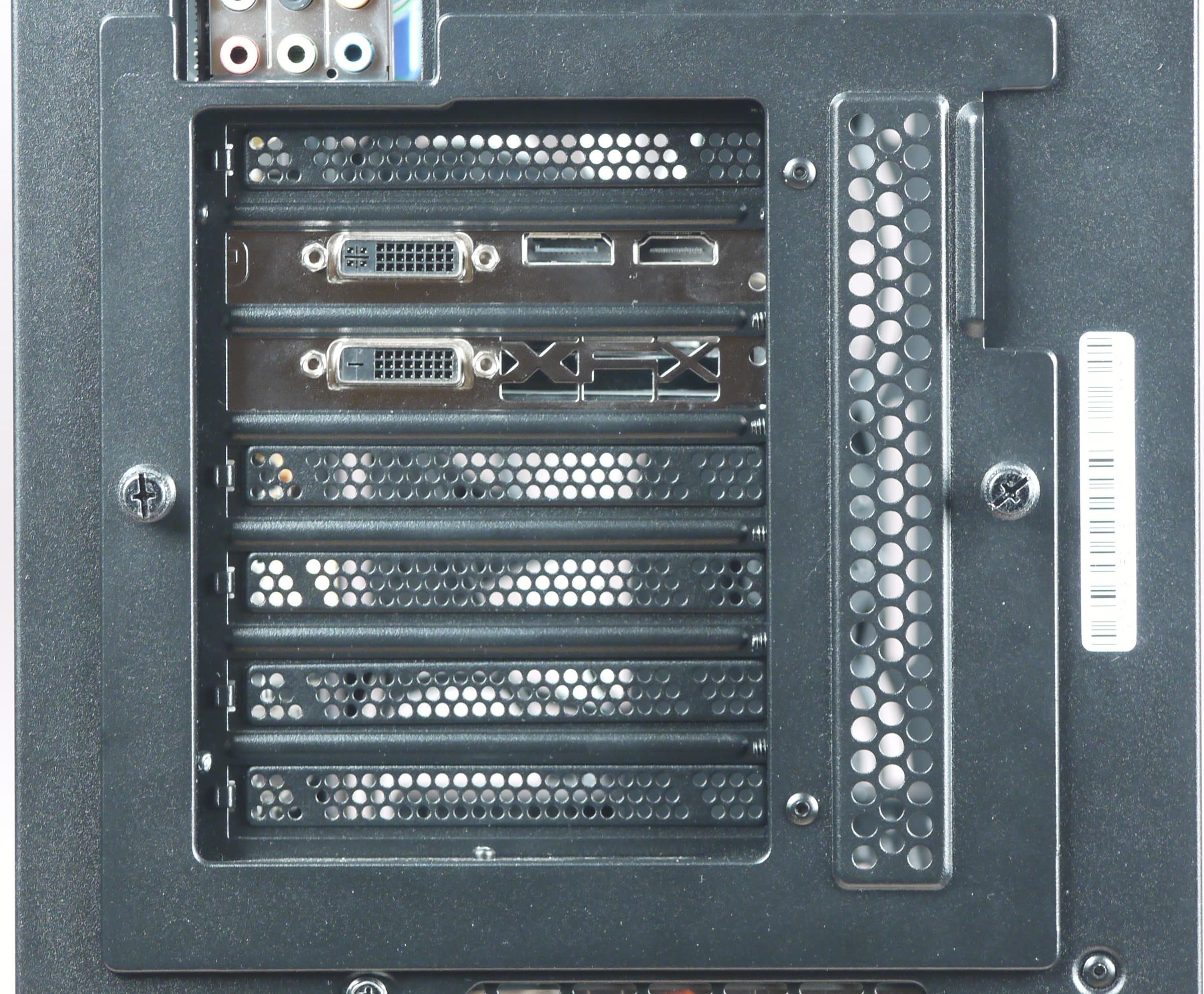 Для видеокарт в данном корпусе возможны два способа установки: горизонтальный (непосредственно в слот расширения системной платы) и вертикальный (параллельно плате, подключение с помощью отдельно приобретаемого райзера). Понятно, что для этого потребуется разное положение прорезей для карт расширения на задней стенке, и это предусмотрено: для задней стенки есть сменные вставки, закрепляемые четырьмя шаровидными выступами и двумя винтами с накатными головками. При этом предустановленная вставка с семью прорезями может быть установлена двумя способами: в состоянии «из коробки» прорези расположены горизонтально, но можно повернуть ее на 90° и получить вертикальные прорези.