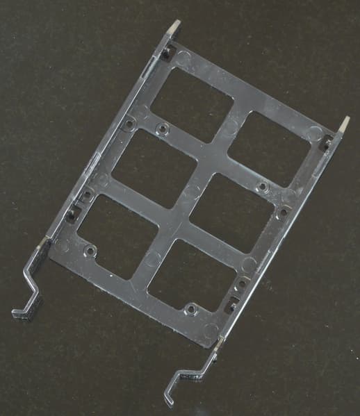 3,5-дюймовые жесткие диски устанавливаются в двухместную корзину с помощью пластиковых салазок, к которым крепятся с помощью штырей и винтов. Салазки универсальные, рассчитаны и на 2,5-дюймовые HDD/SSD, закрепляемые винтами через дно, каких-либо дополнительных амортизирующих элементов не предусмотрено. В корзине салазки фиксируются защелками, а выступающие рукоятки позволяют легко извлекать их.