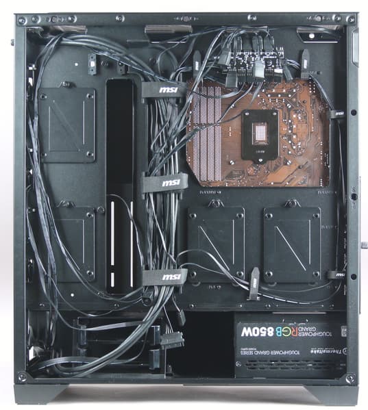 Между основанием для системной платы и правой боковой стенкой остается около 25 мм, чего вполне достаточно для прокладки кабелей. Для их аккуратного монтажа предусмотрен пластиковый кабель-канал и многоразовые стяжки с «липучками», в комплекте есть и одноразовые стяжки.