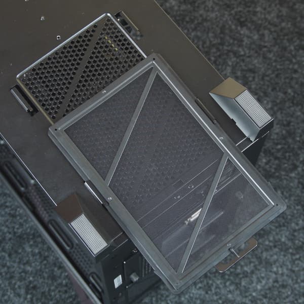 Одно из них — отсутствие декоративной верхней крышки. Сетка съемного фильтра на эту роль годится не очень, поэтому вид сверху глаз особо не радует. Конечно, это важно далеко не всегда, а для офисного компьютера подобное и вовсе было бы вполне приемлемо (сделано-то вполне аккуратно), но напомним, что корпус заявлен как игровой, хотя и в игровых моделях такое нам встречалось.