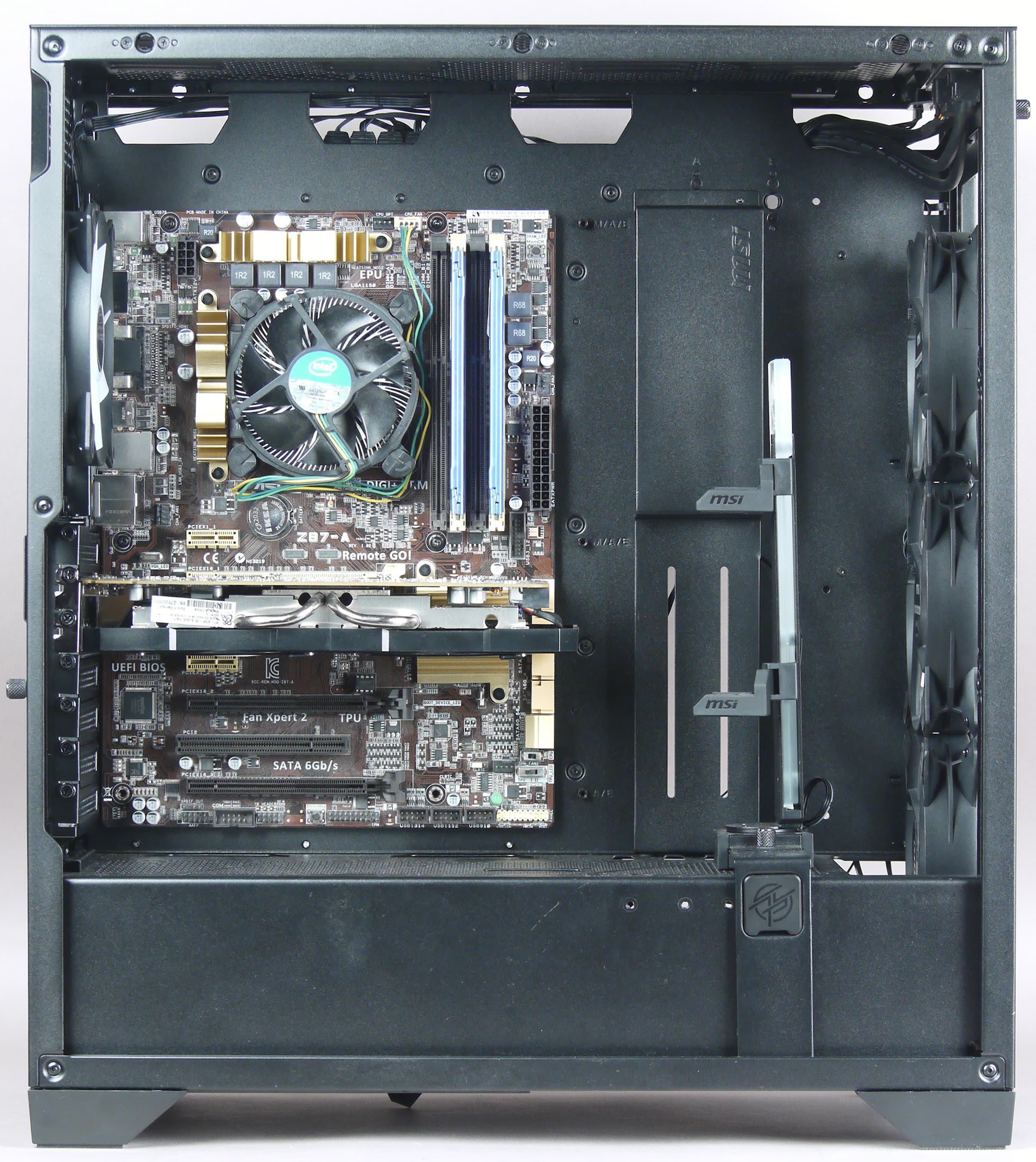 На поверхностях корпуса возможна установка немалого количества вентиляторов: типоразмера 120 мм — до семи штук, 140 мм — до шести. Посадочные места для них предусмотрены спереди (на съемной раме), вверху и сзади.