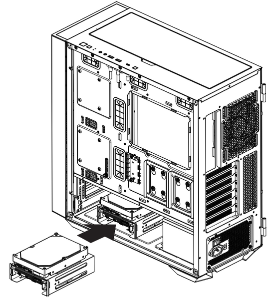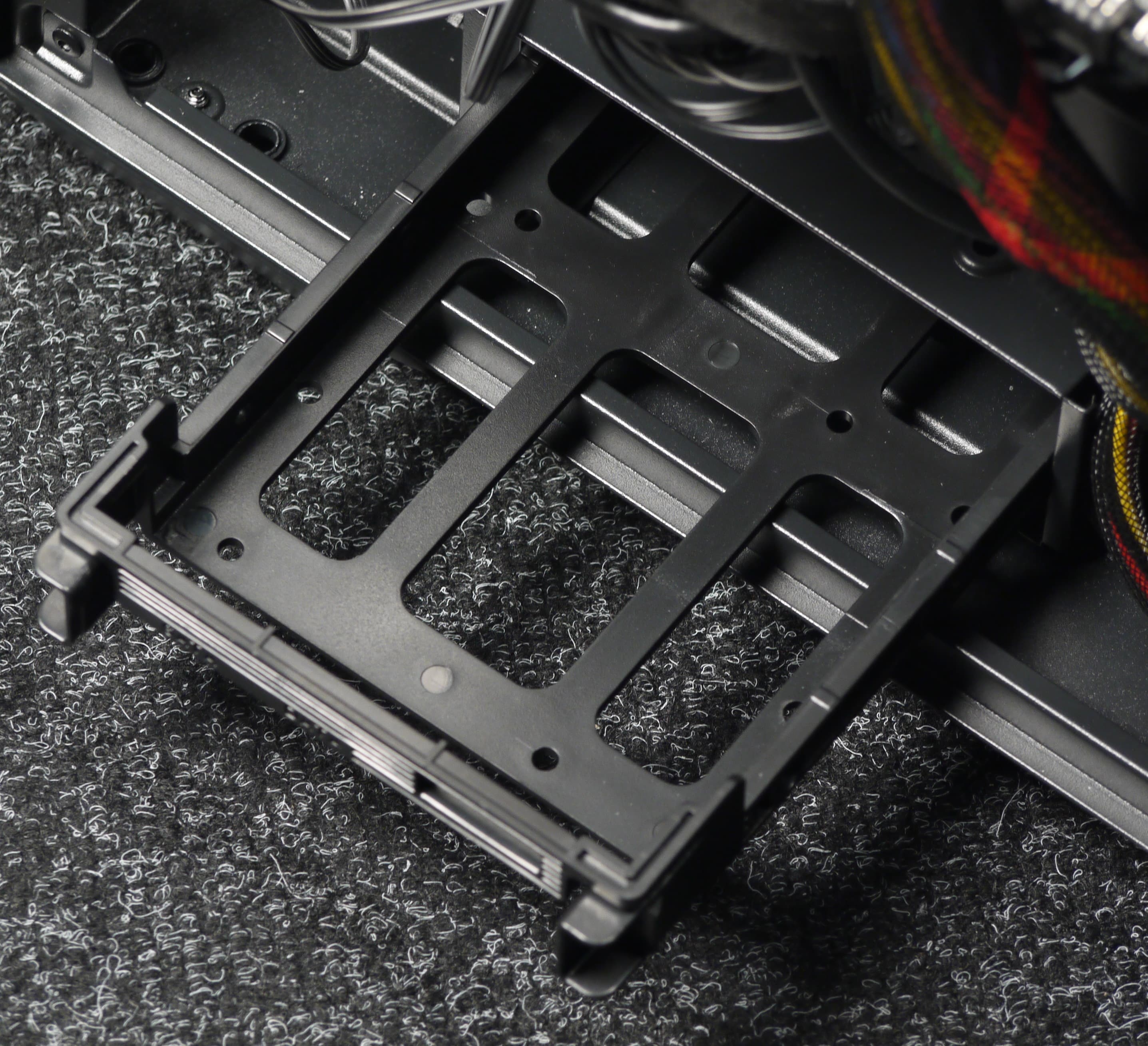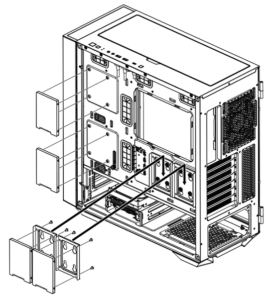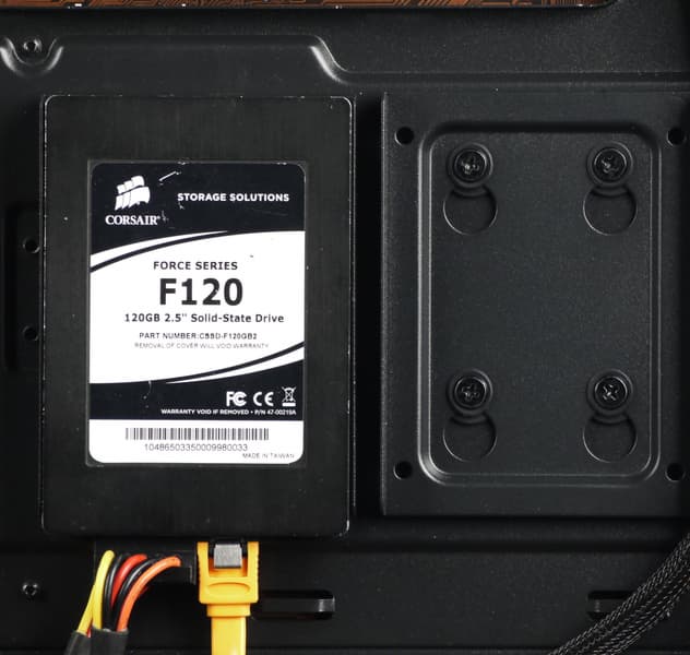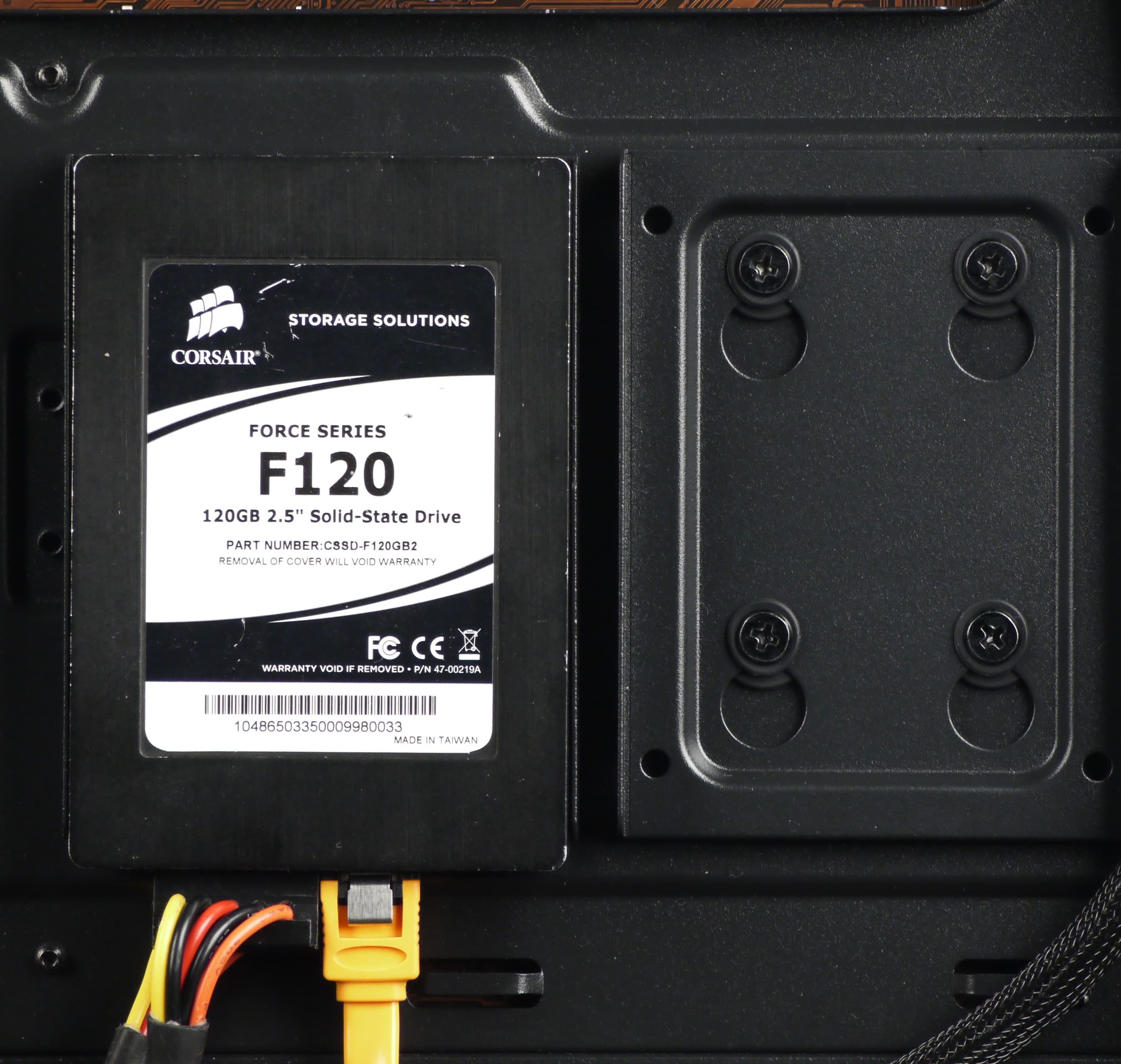 Для накопителей формата 2,5″ предусмотрены два посадочных места на обратной стороне основания для системной платы около передней стенки шасси. Фиксация накопителя осуществляется при помощи винтов, которые нужно закрутить в накопитель со стороны дна сквозь основание для системной платы (с лицевой стороны).