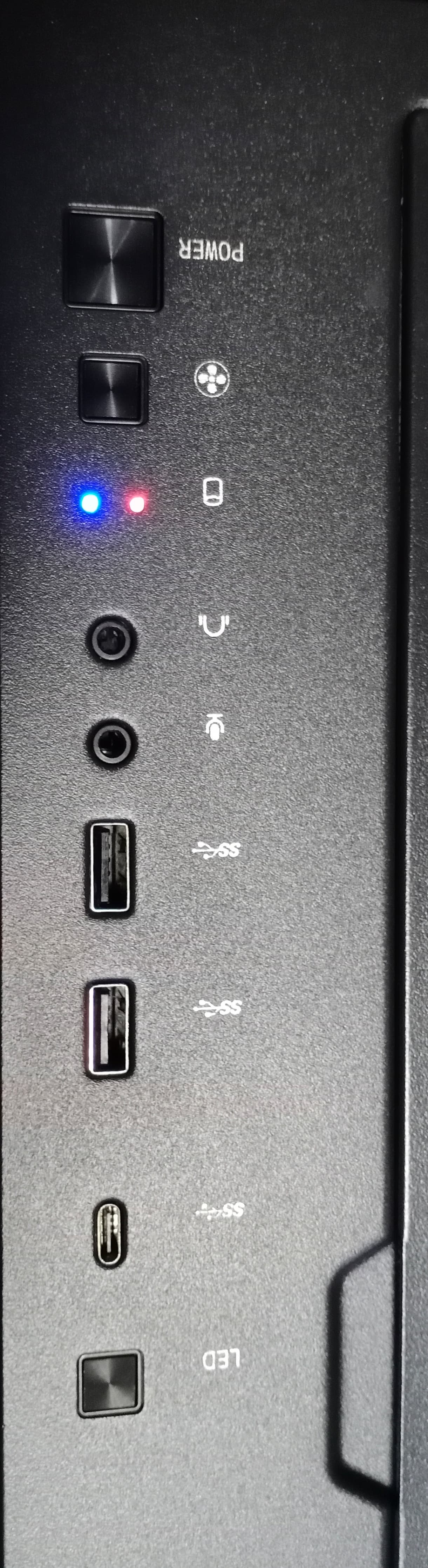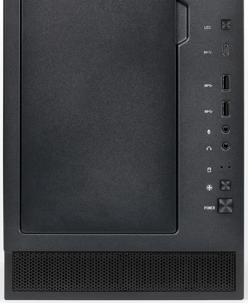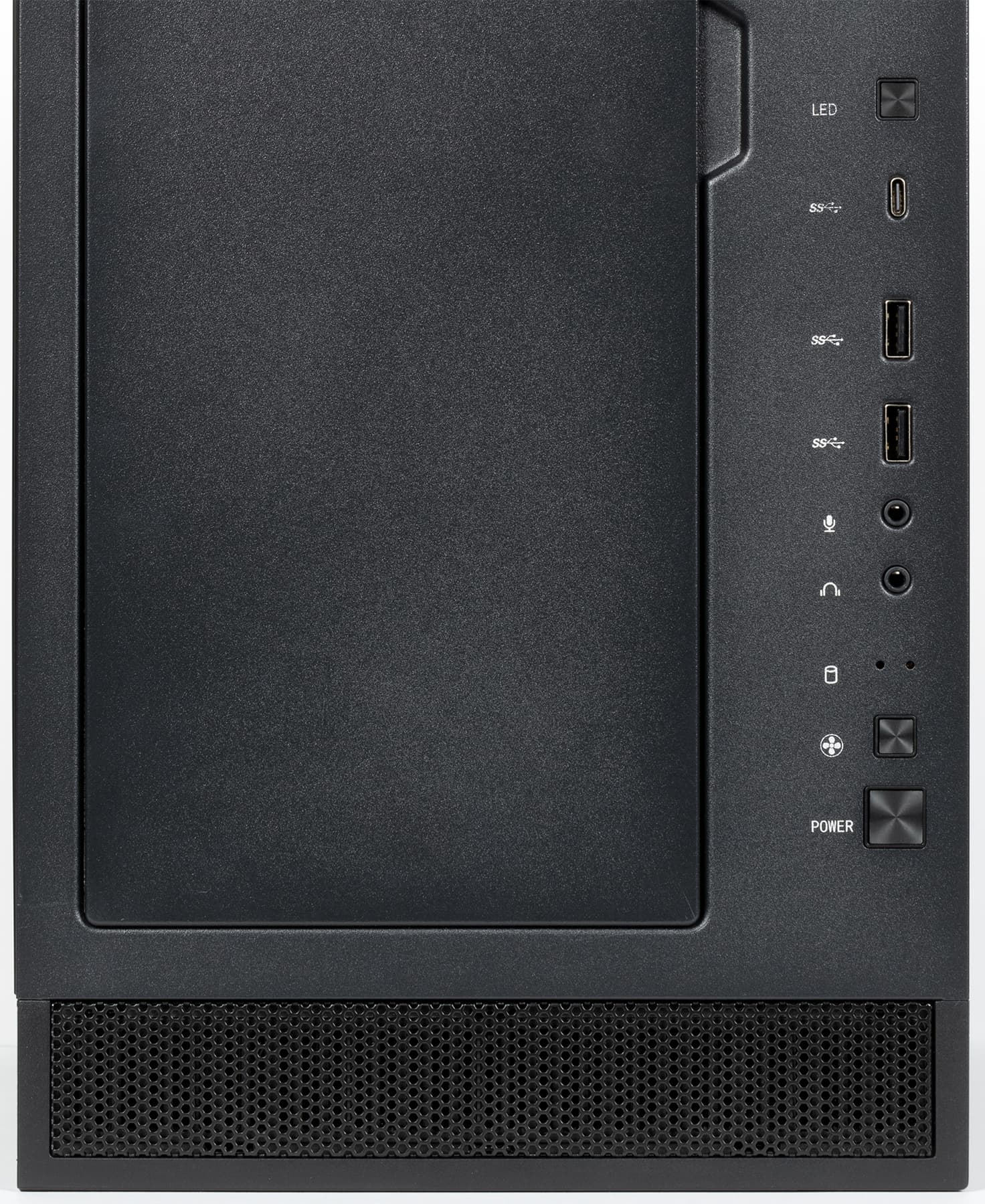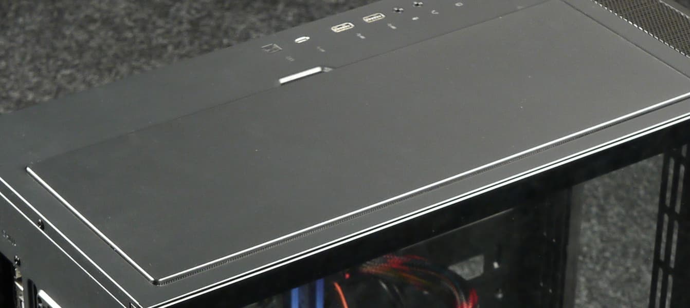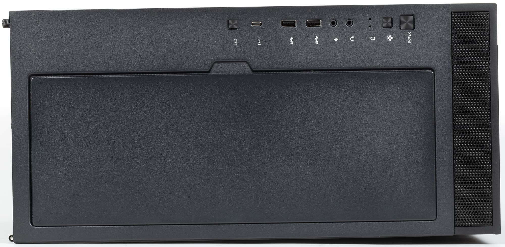 Интерфейсные разъемы и кнопки расположены на верхней панели вдоль правой стенки корпуса. Здесь есть два порта USB3 Gen1 (USB 3.0), один порт USB3 Gen2 (USB 3.1) Type-C, отдельные разъемы для подключения микрофона и наушников, кнопка включения, кнопка управления подсветкой и кнопка управления режимами работы вентиляторов (для кнопки перезагрузки места не нашлось). Также в этой области расположены два индикатора: синего (включения) и красного (активность накопителей) цветов.