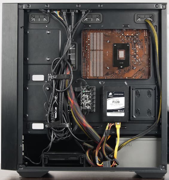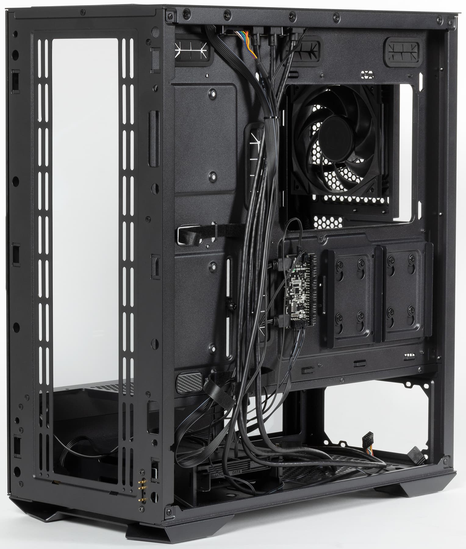 Глубина отсека для прокладки проводов составляет около 22 мм у задней стенки. Для монтажа проводов предусмотрены петли для крепления стяжек или других аналогичных изделий. Для удобства прокладки проводов предусмотрены монтажные отверстия в основании для системной платы и кожухе блока питания, в которых установлены лепестковые мембраны.