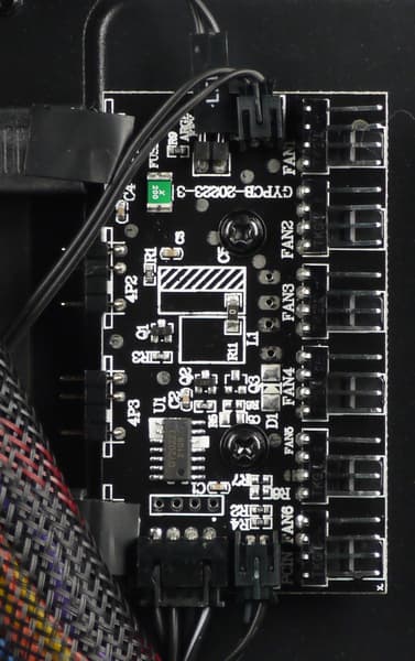 Первая лента установлена под кожухом БП, ее видно с левой стороны через световод и прозрачное окно. Вторая лента установлена в нижней части шасси под передней панелью. При желании имеющуюся систему подсветки можно подключить к совместимой системной плате или же стороннему контроллеру. Для этого у штатного контроллера имеется соответствующий шнур с разъемом для системных плат Asus, MSI, ASRock и аналогичных. Контроллер поддерживает ручное управление при помощи кнопки на верхней панели. Питание системы подсветки осуществляется через разъем SATA Power.