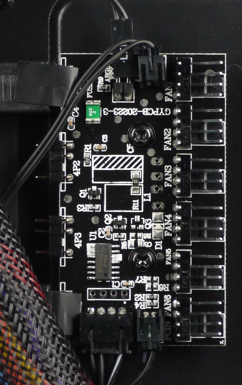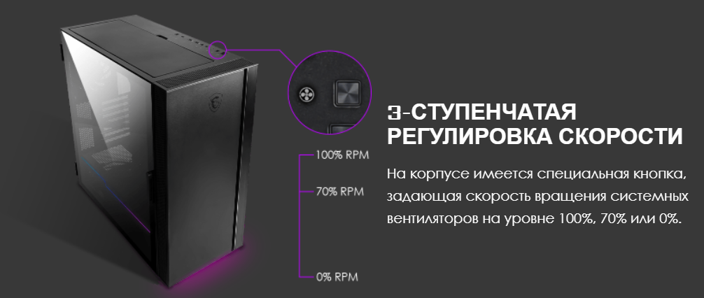 Контроллер в корпусе используется действительно многофункциональный: помимо управления подсветкой, он умеет управлять еще и скоростью вращения вентиляторов с ШИМ (с четырехконтактными разъемами). Реализовано это переключением между тремя фиксированными режимами (путем последовательного перебора). Такой вариант несколько менее удобен, чем трансляция управляющего сигнала ШИМ с разъема системной платы, но тоже вполне имеет право на жизнь.