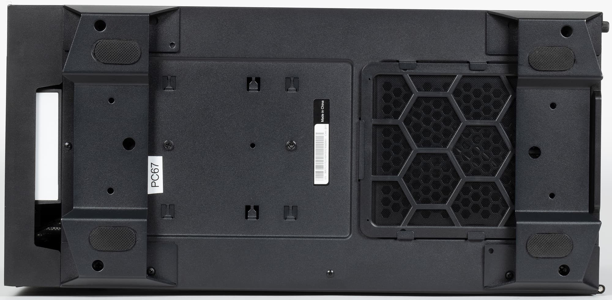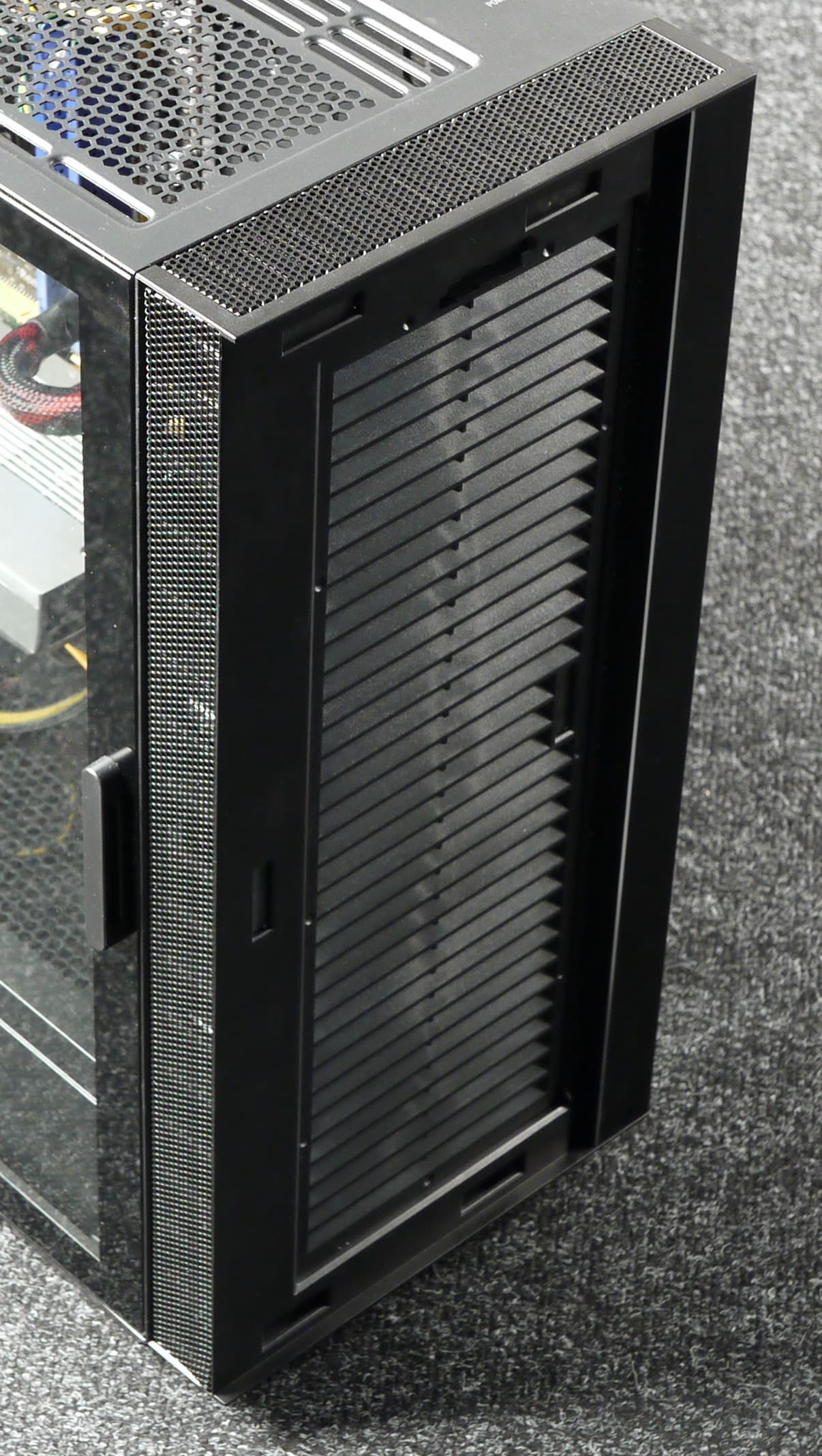 Спереди установлен фильтр из такого же материала, но место его установки не слишком удачно. Дело в том, что достаточно большая часть вентиляционных отверстий на торцах передней панели расположены за фильтром, поэтому воздух, попадающий в корпус через них, никак фильтроваться не будет. К этому можно добавить наличие штатной заглушки, которая полностью перекрывает фильтр, а также упомянуть отверстия по бокам передней панели, которые закрыты только стальной решеткой или не закрыты вовсе (снизу). В итоге можно сделать вывод, что эффективность данного фильтра будет околонулевой, а установлен он в основном для красоты.