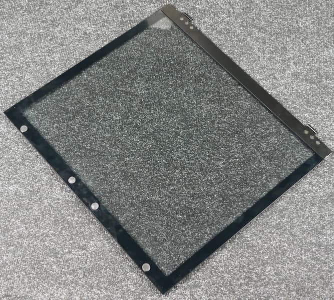 Подвес панели осуществляется на разъемные петли со стороны задней стенки. Имеется механизм фиксации при помощи магнитов, которые приклеены непосредственно к стеклу. Поверх магнитов наклеены тонкие накладки из резиноподобного материала.