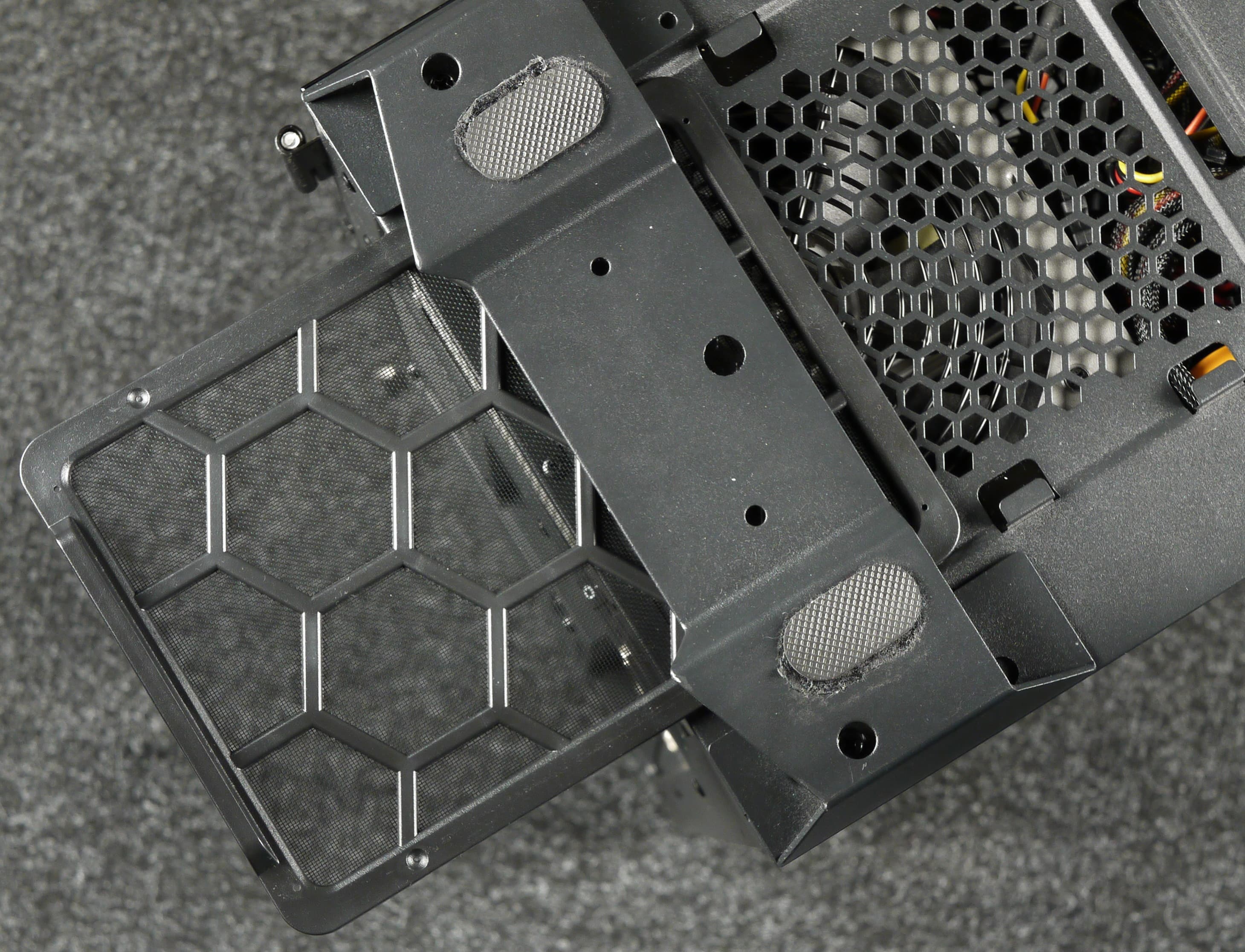 Шасси корпуса используется относительно бюджетное: толщина стали — всего 0,6 мм. Заметны усилия, направленные на увеличение жесткости конструкции путем использования деталей специальной формы, однако стали все равно использовано не слишком много, поскольку в элементах имеются большие отверстия и проемы. Ситуацию спасает стеклянная стенка, а также различные накладки, поэтому общая жесткость конструкции получилась вполне достойная, да и звук пустого ведра, который издают при постукивании большинство стальных корпусов, здесь почти полностью отсутствует.