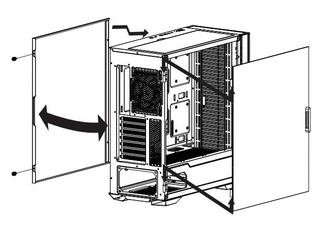 Правая стенка крепится с помощью двух винтов с накатной головкой и распашной системы. Подобная система крепления в разных вариациях довольно часто встречается в среднебюджетных корпусах. Стальная стенка по удобству манипулирования почти не уступает нормально работающей конструкции с разъемными петлями.