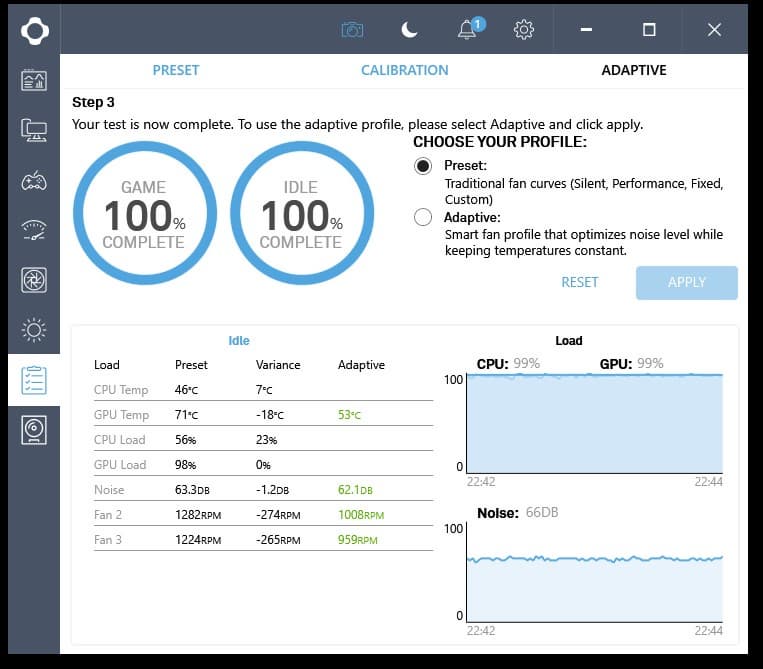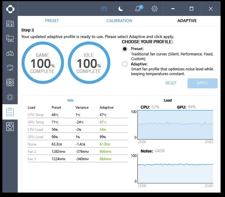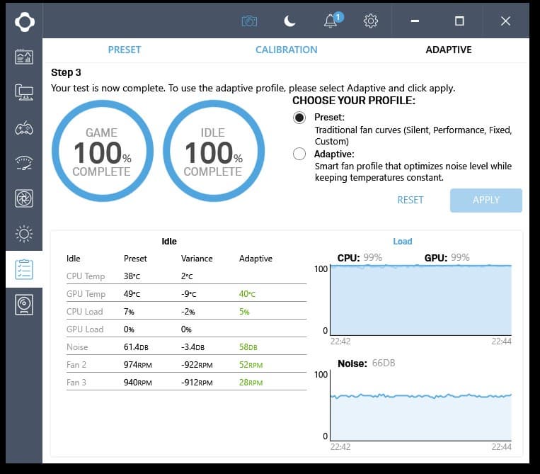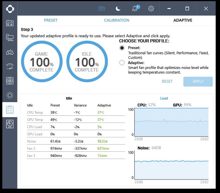 На выходе, после отправки данных в облако и вычислений с применением нейросетей, программа предлагает два адаптивных профиля: для режима простоя и для работы под нагрузкой. На словах может звучать интересно, но на деле у этого алгоритма в текущей реализации есть масса недостатков. Во-первых, очень много времени уходит на первоначальную настройку. Во-вторых, CAM не умеет создавать синтетическую нагрузку на GPU и измеряет шум и температуру, нагружая только лишь процессор. В-третьих, в ряде случаев программа получает заведомо неправильные показатели температуры компонентов, рапортуя при этом об успешно проведенной оптимизации профиля. Ну и, наконец, в-четвертых, рекомендации системы значительно отличаются раз от раза при неизменности условий тестирования.