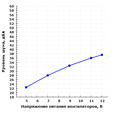 Уровень шума системы охлаждения корпуса изменяется в относительно широких пределах от 22.5 до 37,5 дБА, в таких же пределах изменяется и ее производительность. При питании вентиляторов напряжением 5 В шум находится на очень низком уровне даже при расположении микрофона в ближнем поле.