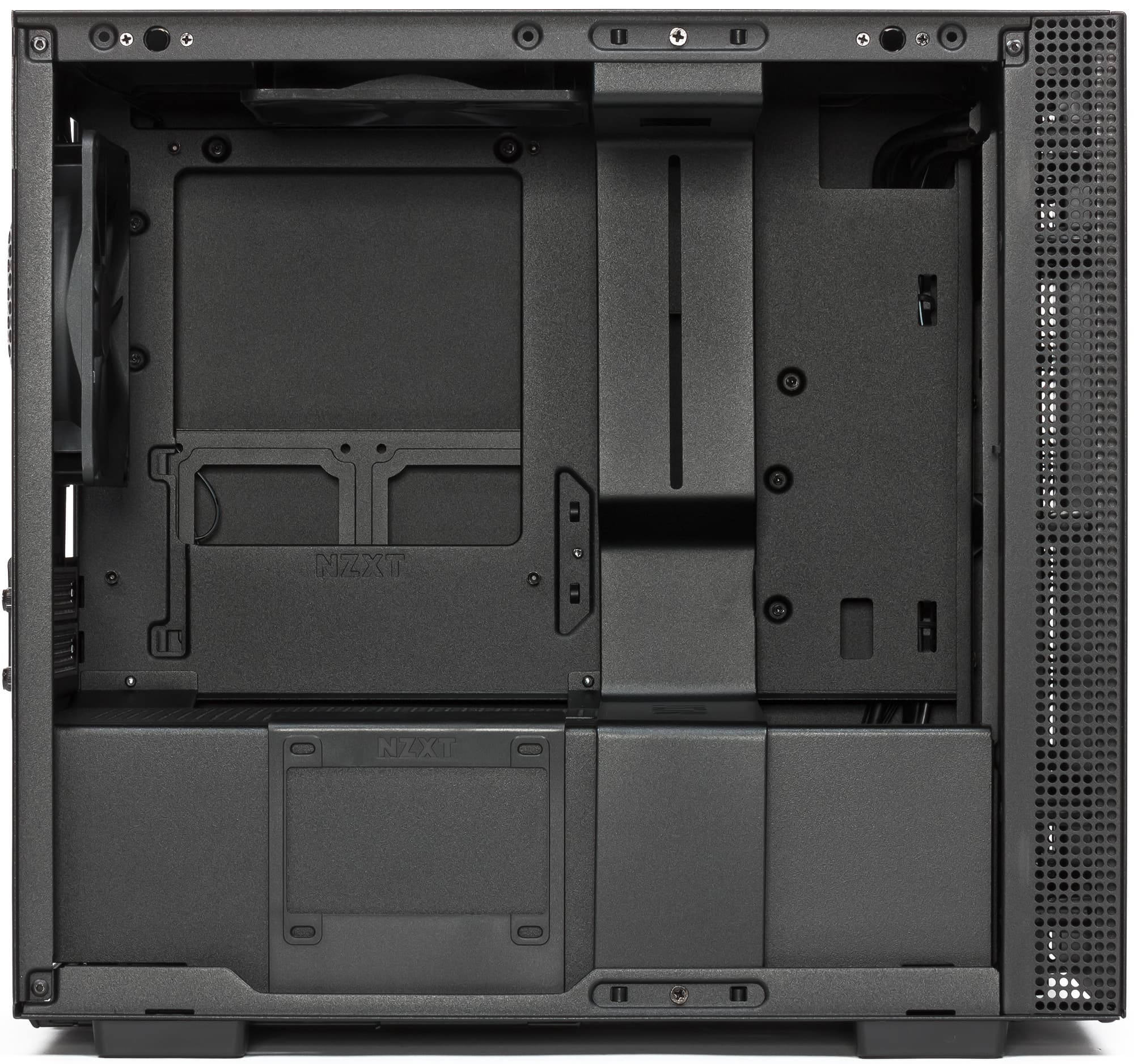 Проектировщики NZXT предусмотрели достаточно удобную систему укладки проводов, которая с правой стороны состоит из пластиковых каналов, направляющих, липучек и тканевых стяжек, а с левой — из прорезей в нужных местах и скрывающей выходящие кабели стальной полосы. Если грамотно подобрать сочетание блока питания (как вариант — дополнительных удлинителей для него) и системной платы, то финальная сборка будет выглядеть максимально лаконично.