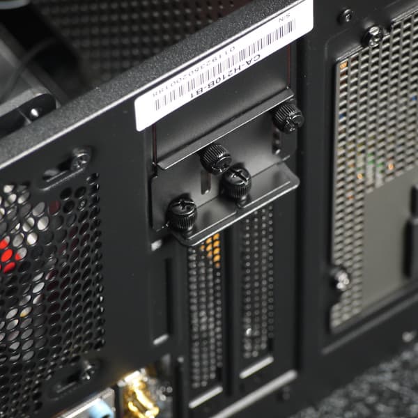 Система фиксации карточек тут самая обычная — крепление на винтах снаружи корпуса с индивидуальной фиксацией и общей декоративной накладкой, которая фиксируется двумя винтами с накатной головкой. Все заглушки для плат расширения съемные, фиксируются одним винтом с накатной головкой.