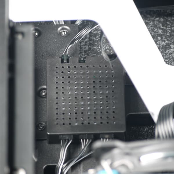 В корпусе имеется кожух блока питания. Он закрывает место установки блока питания со стороны прозрачной левой стенки, придавая внутреннему виду корпуса аккуратность и законченность. Именно это и является его основной функцией — прятать блок питания с проводами. Кожух не полноразмерный и имеет большое количество вентиляционных отверстий.