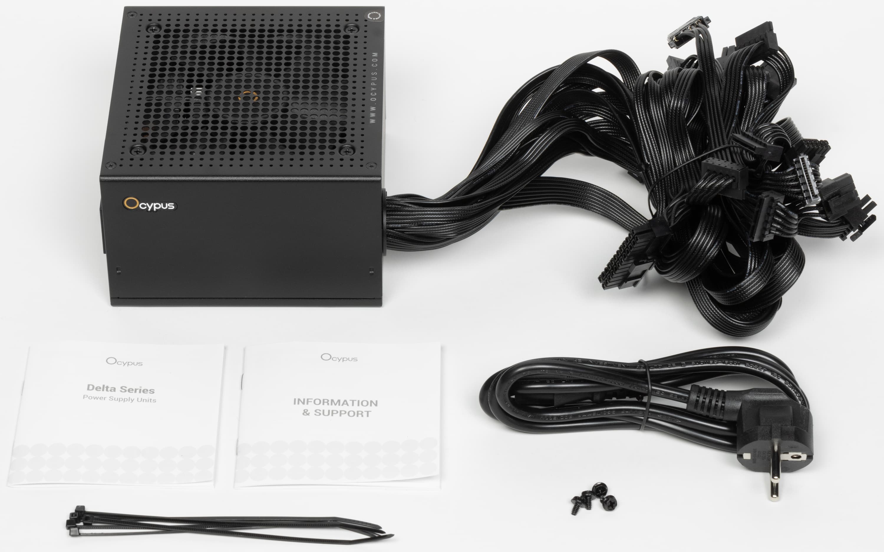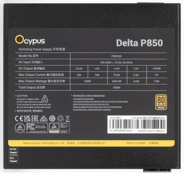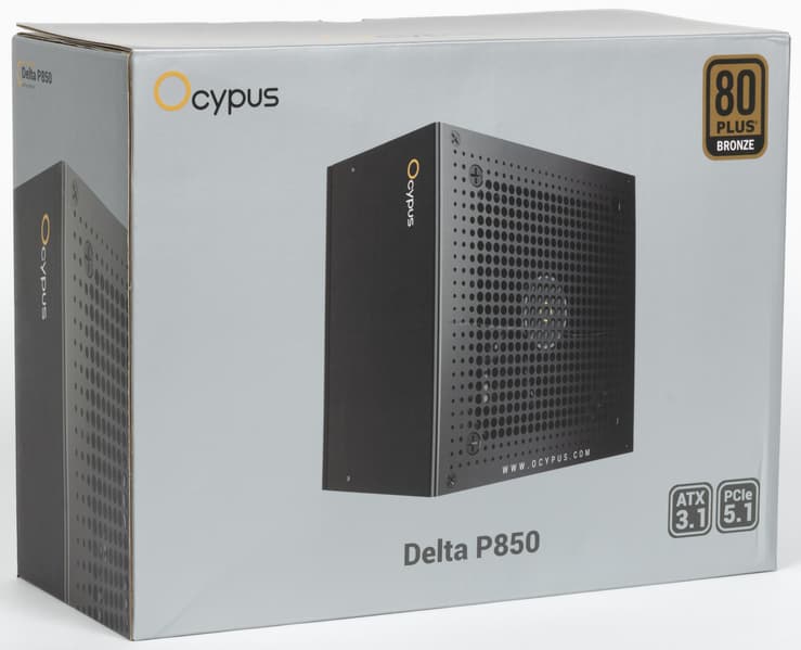 К нам на тестирование попал относительно недорогой БП под торговой маркой Ocypus — Delta P850. Это источник питания мощностью 850 Вт, кроме него в данной серии присутствуют только модели мощностью 650 и 750 Вт, а наиболее ходовых решений мощностью 500-550 Вт не предусмотрено. Все модели серии имеют сертификат 80Plus Bronze, а также новый разъем питания для видеокарт PCIe 5.1 (12V-2×6).