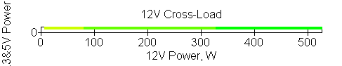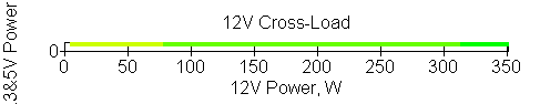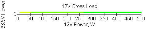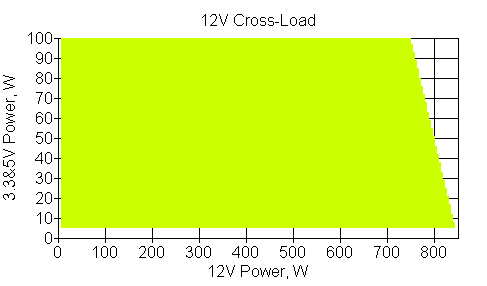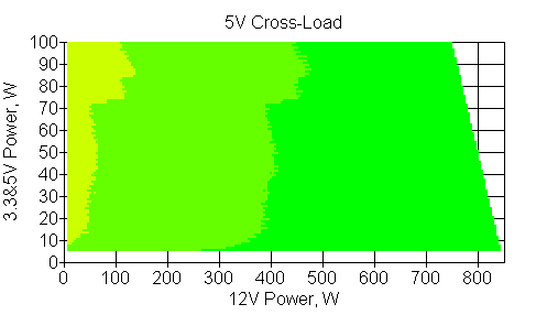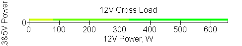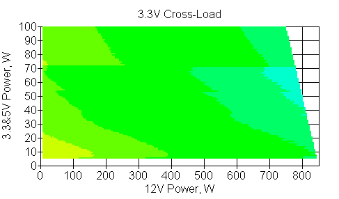 Следующим этапом инструментального тестирования является построение кросснагрузочной характеристики (КНХ) и представление ее на четвертьплоскости, ограниченной максимальной мощностью по шине 3,3&5 В с одной стороны (по оси ординат) и максимальной мощностью по шине 12 В с другой (по оси абсцисс). В каждой точке измеренное значение напряжения обозначается цветовым маркером в зависимости от отклонения от номинального значения.