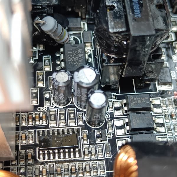 Входной электролит — производства Nippon Chemi-Con (Япония), а вот на низковольтной части явно сэкономили: конденсаторы под торговой маркой CS производства компании 12Kuang Jin Enterprise (Тайвань) — далеко не самый популярный продукт даже в бюджетных блоках питания. Установлено тут и некоторое количество полимерных конденсаторов.