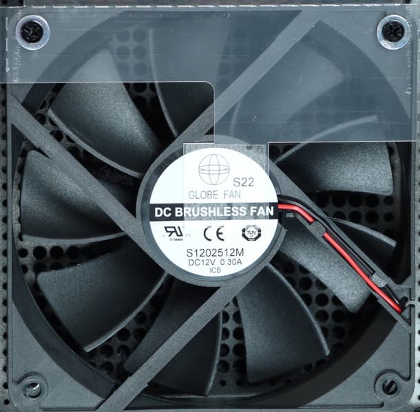 Под решеткой установлен вентилятор S1202512M (2400 об/мин) типоразмера 120 мм, изготовленный компанией Globe Fan. Вентилятор основан на подшипнике скольжения. На гарантийный срок подобных вентиляторов обычно хватает.