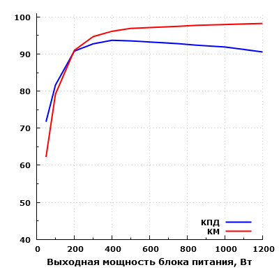 В данном случае мы также приводим и измерения традиционного КПД. Результаты регистрировались при постоянной нагрузке на каналы +3.3VDC (5 Вт) и +5VDC (15 Вт) и изменяемой мощности по каналу +12VDC.