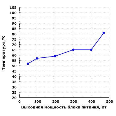 В гибридном режиме охлаждения при остановленном вентиляторе температура в основном не превышала 65 градусов (нормально и безопасно), но ближе к границе автоматического включения вентилятора доходила уже до 81 градуса (при нагрузке 470 Вт) — это очень много для долговременной работы.