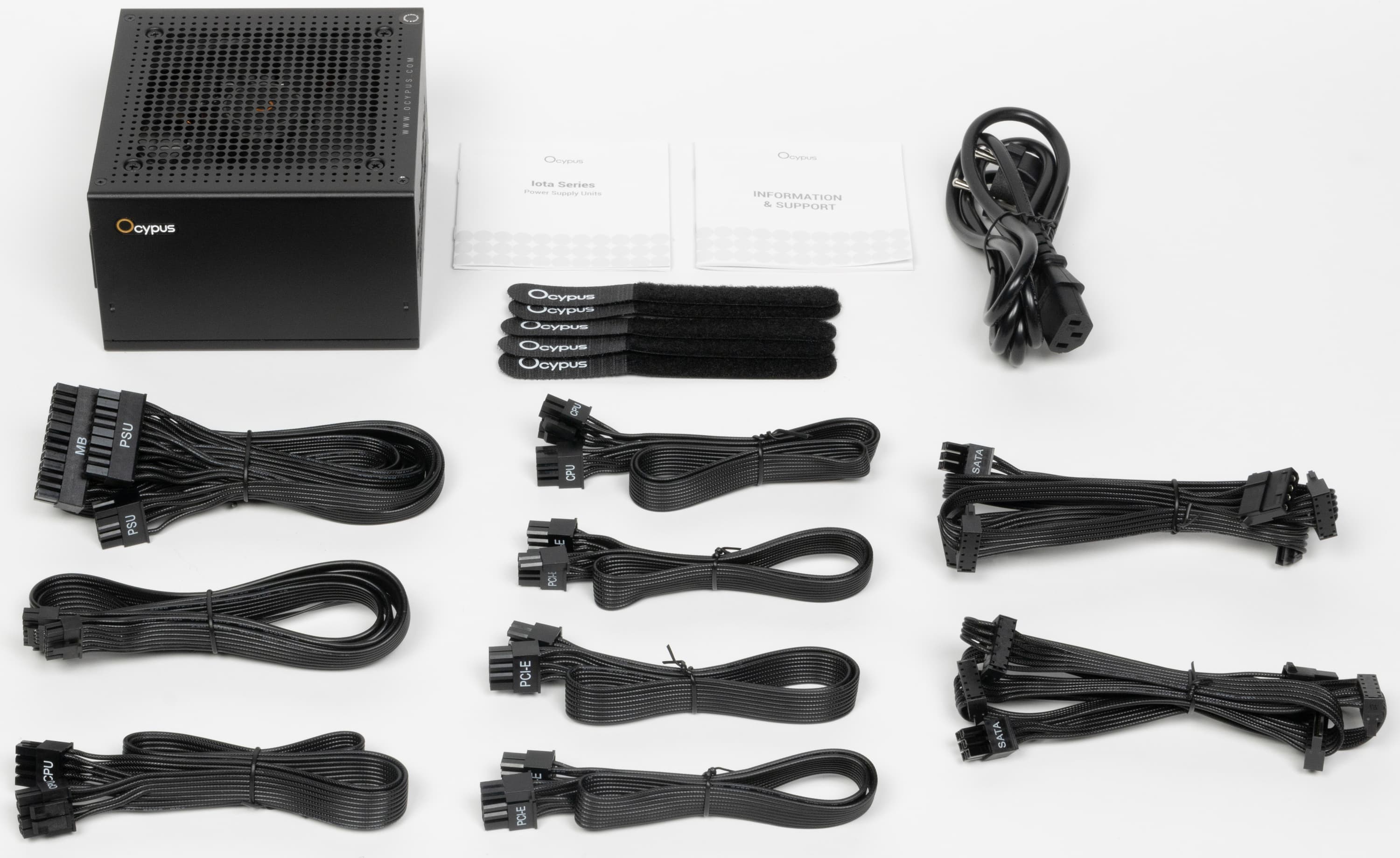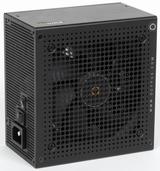 Поставляется блок питания в картонной коробке с матовой полиграфией, которая выполнена в фирменном стиле Ocypus преимущественно в черном и серых цветах.