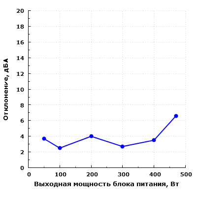 При работе с постоянно вращающимся вентилятором в диапазоне мощности до 500 Вт включительно шум блока питания находится на очень низком уровне для жилого помещения в дневное время суток.