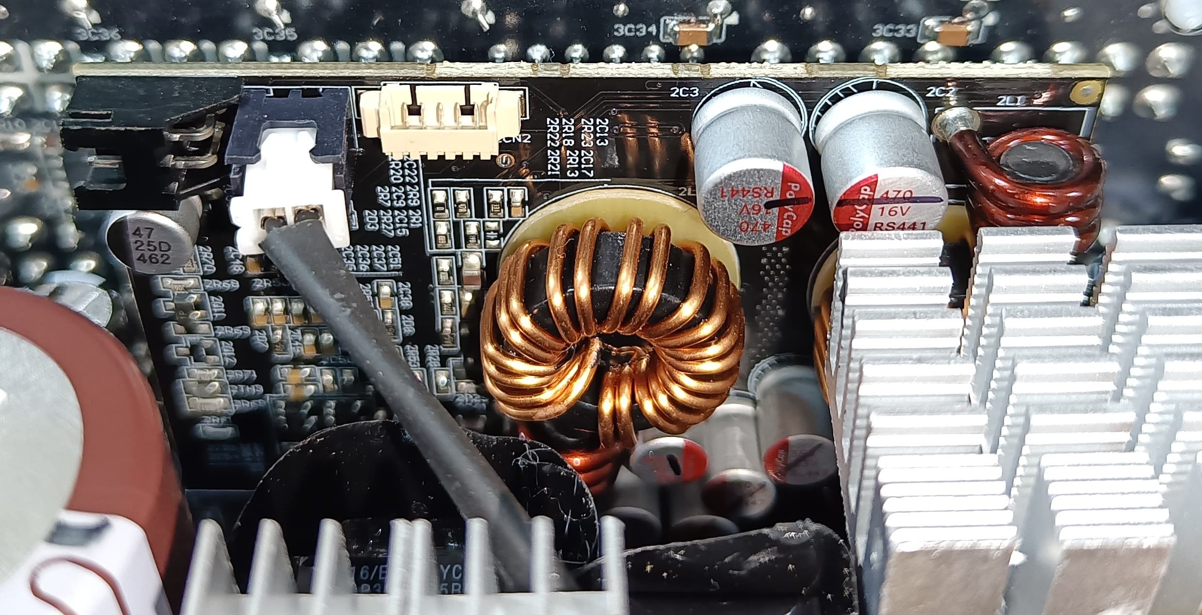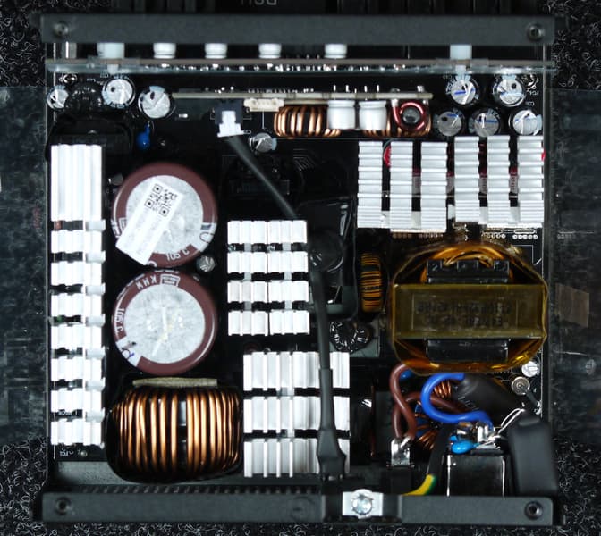 Конструкция блока питания вполне соответствует современным тенденциям: активный корректор коэффициента мощности, синхронный выпрямитель для канала +12VDC, независимые импульсные преобразователи постоянного тока для линий +3.3VDC и +5VDC.