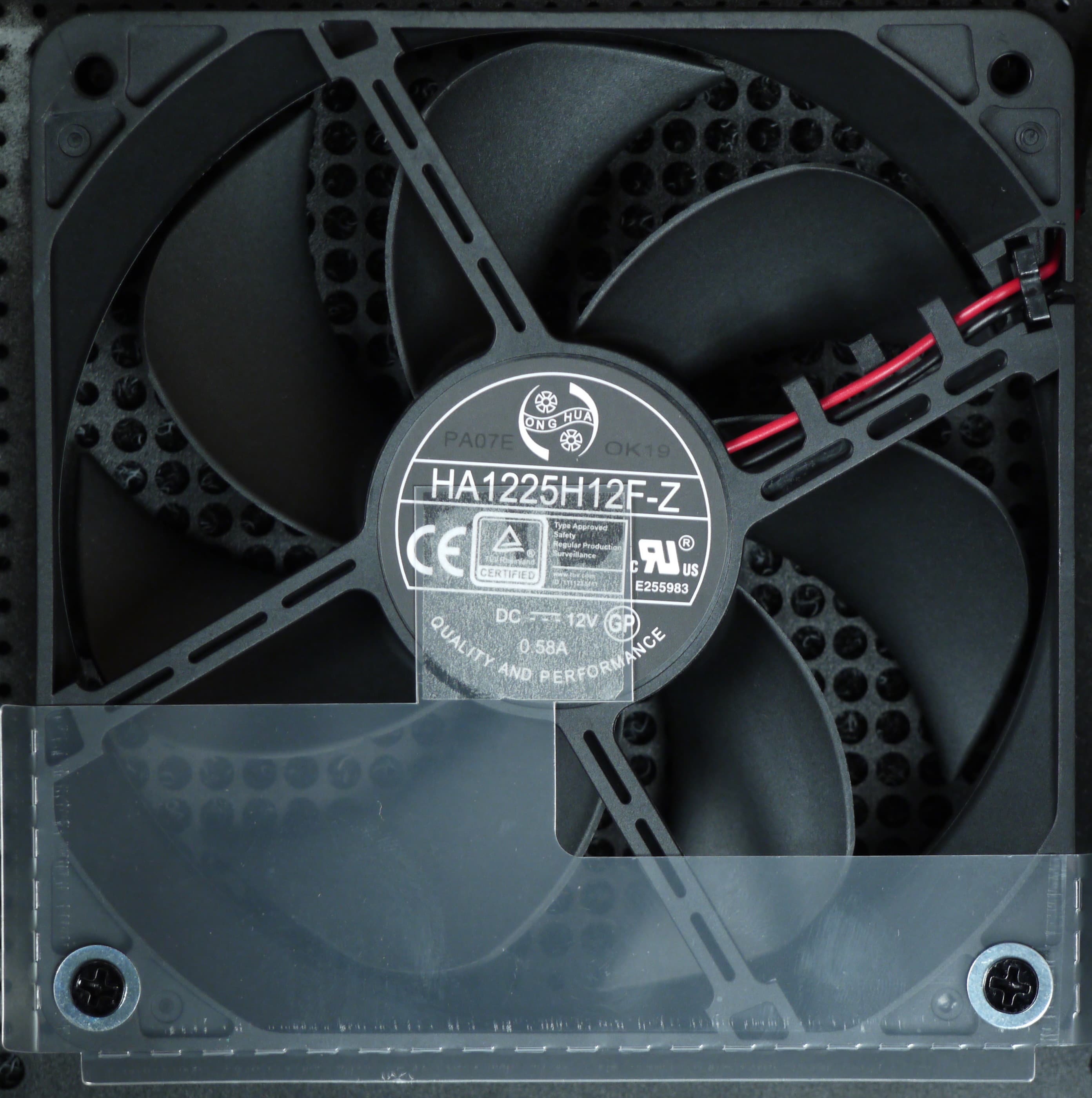 В блоке питания установлен вентилятор HA1225H12F-Z (2200 об/мин), он основан на гидродинамическом подшипнике, что подразумевает очень долгий срок службы. Изготовлен вентилятор компанией Dongguan Honghua Electronic Technology. Подключение вентилятора — двухпроводное, через разъем.