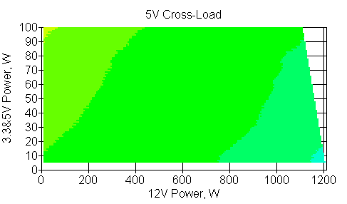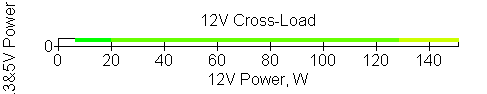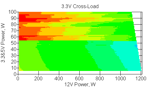 Следующим этапом инструментального тестирования является построение кросснагрузочной характеристики (КНХ) и представление ее на четвертьплоскости, ограниченной максимальной мощностью по шине 3,3&5 В с одной стороны (по оси ординат) и максимальной мощностью по шине 12 В с другой (по оси абсцисс). В каждой точке измеренное значение напряжения обозначается цветовым маркером в зависимости от отклонения от номинального значения.