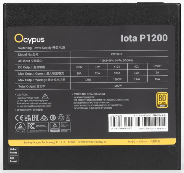 Ocypus Iota P1200 — достойная реализация блока питания особо высокой мощности с соответствующей ценой. Его технико-эксплуатационные характеристики находятся на хорошем уровне, чему способствуют высокая нагрузочная способность канала +12VDC, высокая экономичность, высококачественный вентилятор с гидродинамическим подшипником, а также конденсаторы японских производителей. Можно прогнозировать достаточно долгий срок службы данной модели даже при высоких нагрузках и активной эксплуатации. Блок питания позволяет длительно работать с остановленным вентилятором на мощности до 470 Вт.