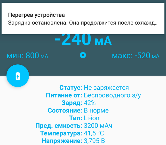 Из-за перегрева зарядка была прекращена контроллером смартфона, но после некоторого остывания, занявшего несколько минут, автоматически возобновилась.