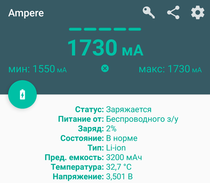 Начальный ток заряда аккумулятора смартфона был очень приличным — более 1,7 А, соответственно и нагрев был заметным. Уже через 20 минут температура стала критической (41,5 °C по показаниям Ampere, у верхнего стекла пауэрбанка 41 °C, боковая поверхность возле разъемов 37 °C, в помещении было около 23-24 °C). Очевидно, оба устройства — и смартфон, и внешний аккумулятор — нагревались и подогревали друг друга, причем отвод тепла от поверхностей взаимодействия был недостаточным.