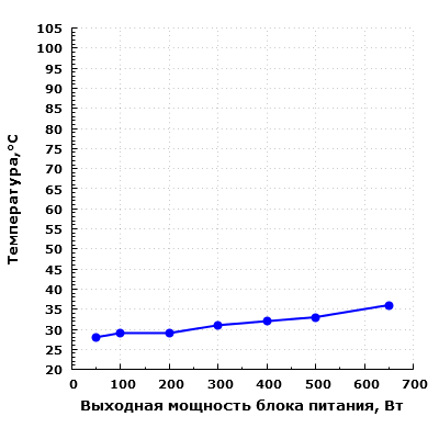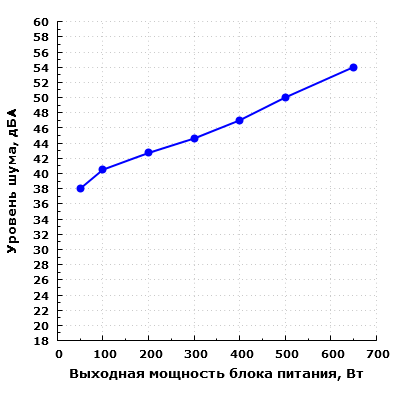 При дальнейшем увеличении выходной мощности уровень шума блока питания повышается, при мощности 500 Вт он достигает значения 50 дБА. Это очень высокий уровень шума, который доставляет сильный дискомфорт в домашних условиях.