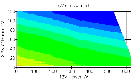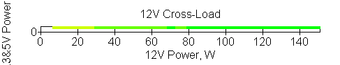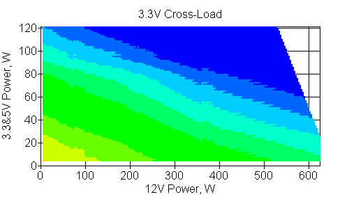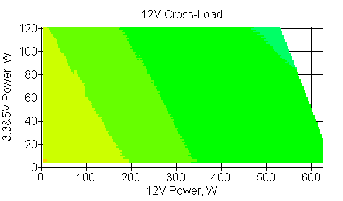 Следующим этапом инструментального тестирования является построение кросснагрузочной характеристики (КНХ) и представление ее на четвертьплоскости, ограниченной максимальной мощностью по шине 3,3&5 В с одной стороны (по оси ординат) и максимальной мощностью по шине 12 В с другой (по оси абсцисс). В каждой точке измеренное значение напряжения обозначается цветовым маркером в зависимости от отклонения от номинального значения.