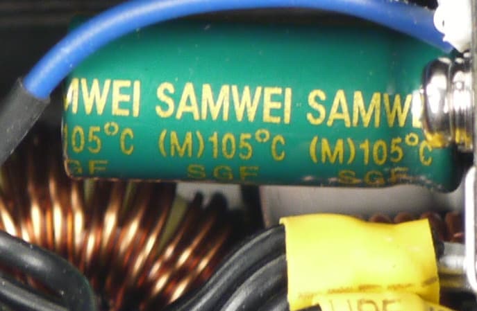В качестве высоковольтных конденсаторов установлены две емкости под маркой Nichicon, низковольтные конденсаторы представлены продукцией под торговой маркой Samwei.