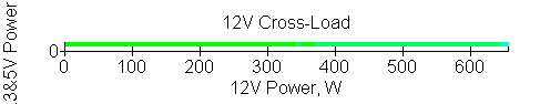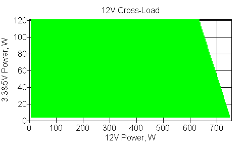 Следующим этапом инструментального тестирования является построение кросснагрузочной характеристики (КНХ) и представление ее на четвертьплоскости, ограниченной максимальной мощностью по шине 3,3&5 В с одной стороны (по оси ординат) и максимальной мощностью по шине 12 В с другой (по оси абсцисс). В каждой точке измеренное значение напряжения обозначается цветовым маркером в зависимости от отклонения от номинального значения.