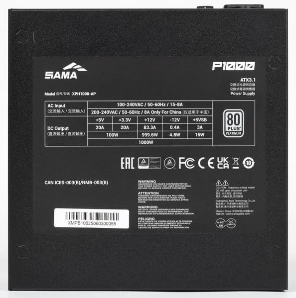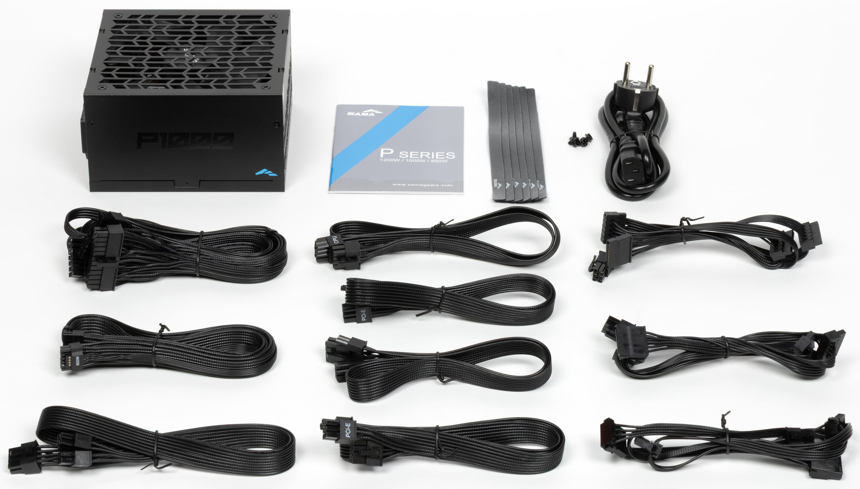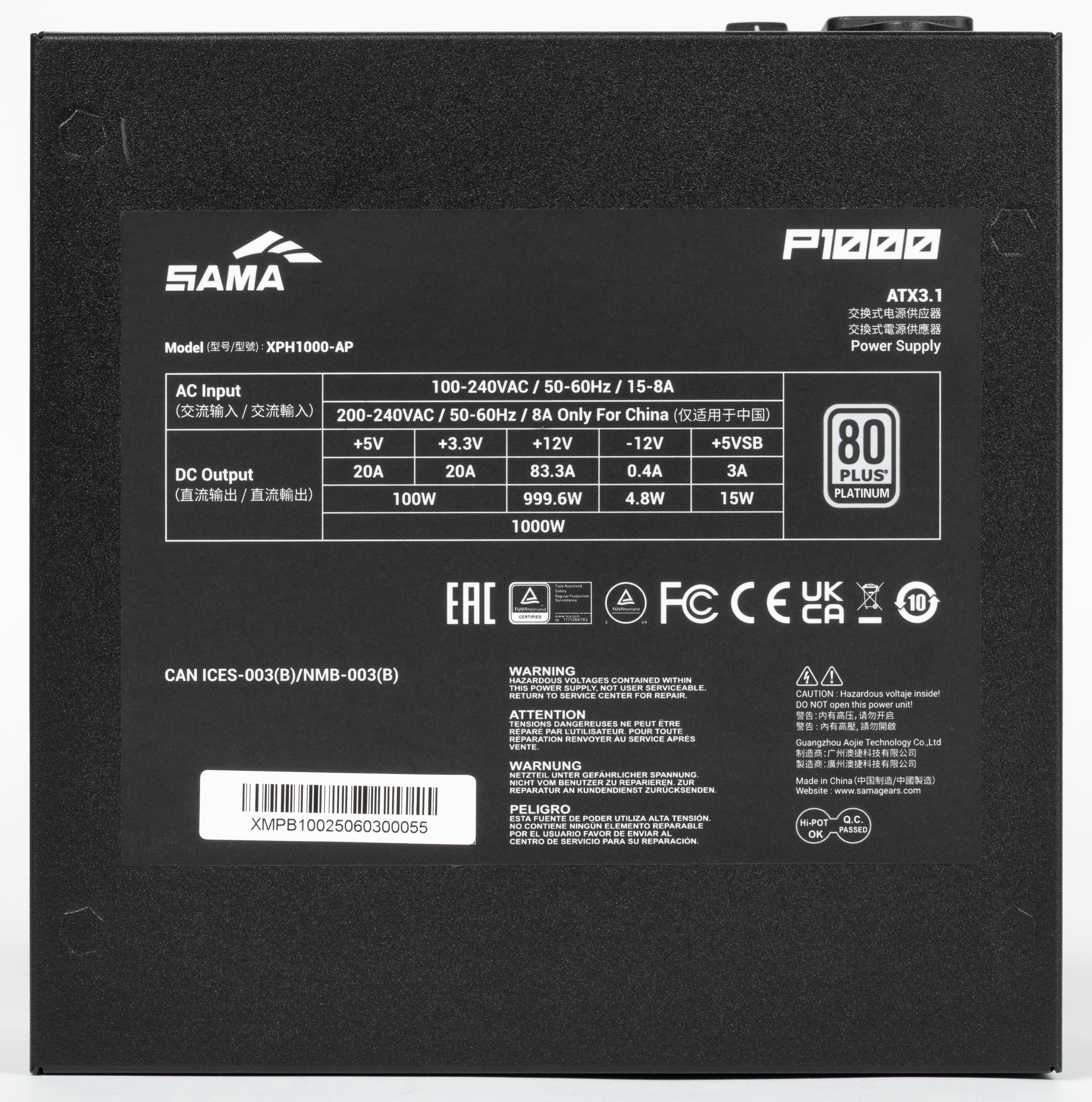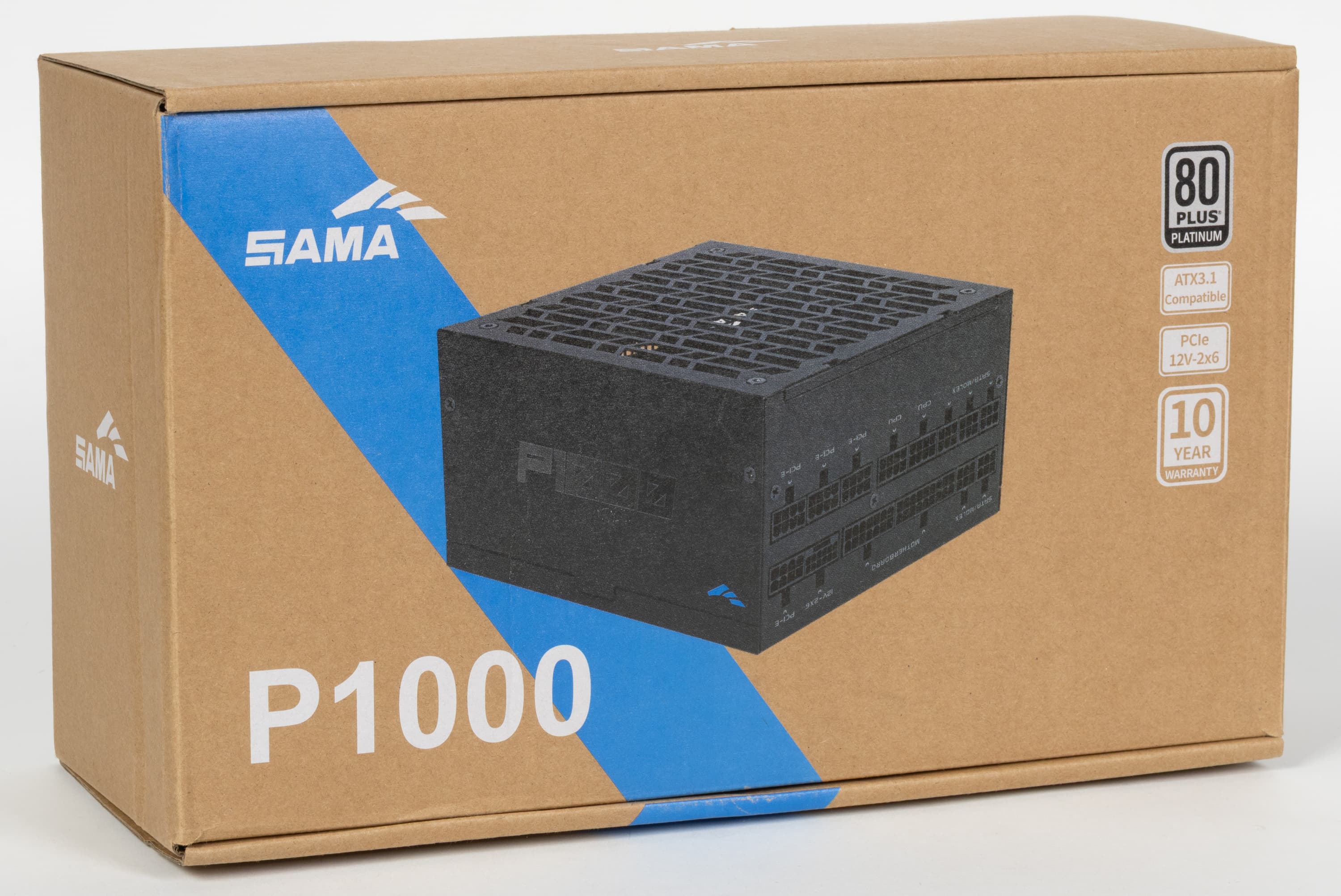 В этот раз мы познакомимся с блоком питания китайской компании Sama из Гуанчжоу — ранее мы уже протестировали несколько ее процессорных кулеров. Модель P1000 имеет мощность 1000 Вт и сертификат 80+ Platinum. Блок питания соответствует стандарту ATX 3.1 и позволяет питать очень мощные современные видеокарты через 16-контактный разъем PCIe 5.1 (12V-2×6). В данной серии существуют также модели мощностью 850 и 1200 Вт.