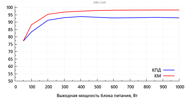 Представление эффективности компьютерного блока питания в виде значения КПД (коэффициента полезного действия) имеет свои традиции. Прежде всего, КПД — это коэффициент, определяемый соотношением мощностей на выходе и на входе блока питания, то есть КПД показывает эффективность преобразования электрической энергии. Обычному же пользователю данный параметр почти ничего не скажет, за исключением того, что более высокий КПД вроде как говорит о большей экономичности БП и более высоком его качестве. Зато КПД стал отличным маркетинговым якорем, особенно в комбинацией с сертификатом 80Plus. Однако с практической точки зрения КПД не оказывает заметного влияния на функционирование системного блока: он не увеличивает производительность, не снижает шум или температуру внутри системного блока. Это просто технический параметр, уровень которого в основном определяется развитием промышленности в текущий момент времени и себестоимостью продукта. Для пользователя же максимизация КПД выливается в увеличение розничной цены.