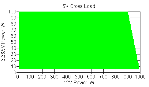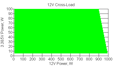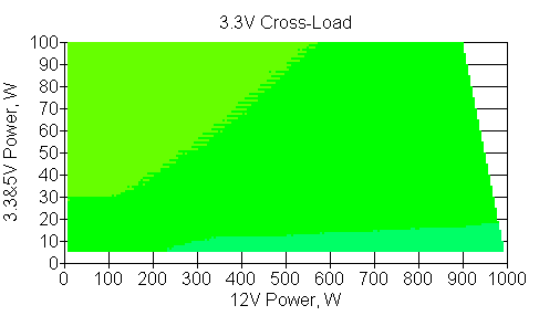 Следующим этапом инструментального тестирования является построение кросснагрузочной характеристики (КНХ) и представление ее на четвертьплоскости, ограниченной максимальной мощностью по шине 3,3&5 В с одной стороны (по оси ординат) и максимальной мощностью по шине 12 В с другой (по оси абсцисс). В каждой точке измеренное значение напряжения обозначается цветовым маркером в зависимости от отклонения от номинального значения.